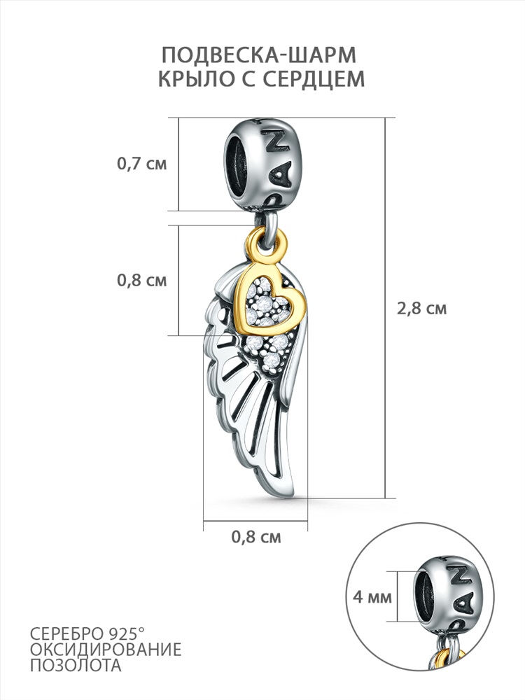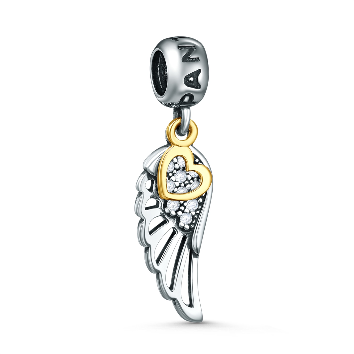 Подвеска-шарм из чернёного серебра с фианитами и позолотой - Крыло и сердце 620076зч