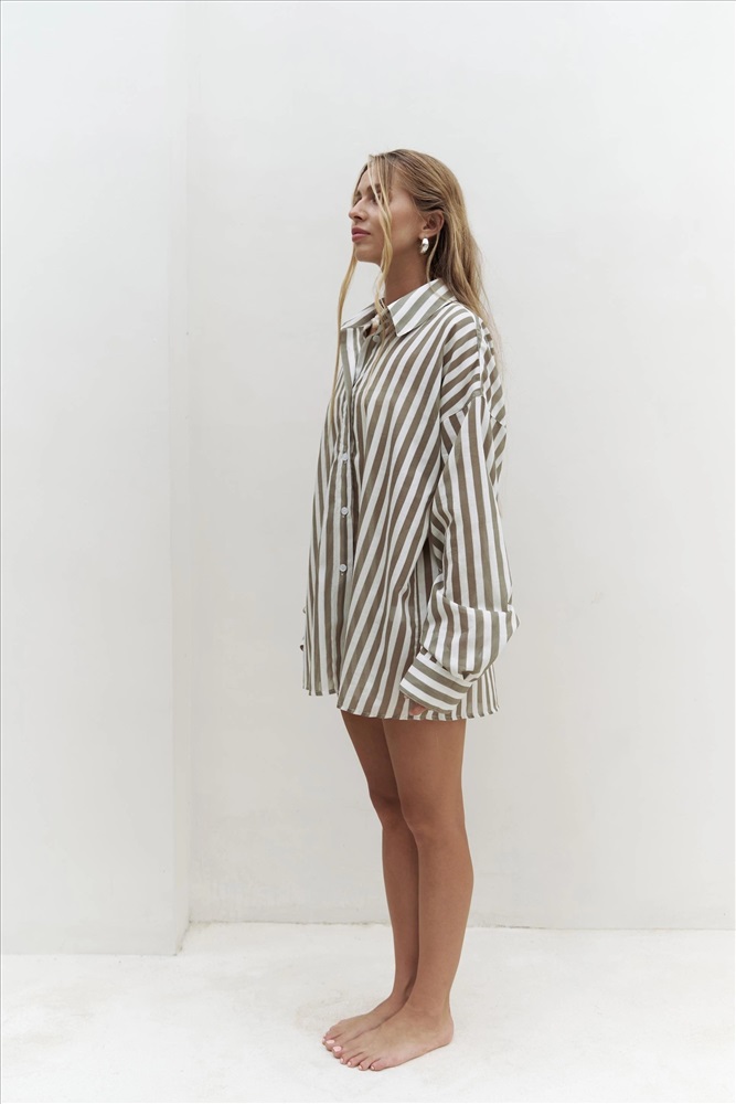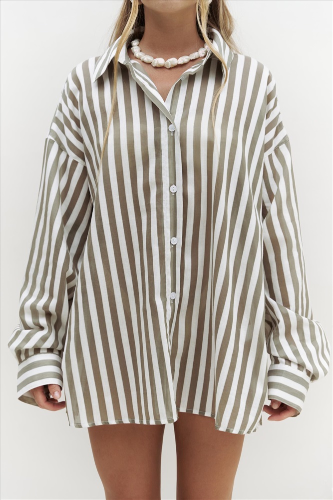 Рубашка оверсайз в полоску из хлопчатобумажной пряжи. Длинные рукава с воротником и манжетами.