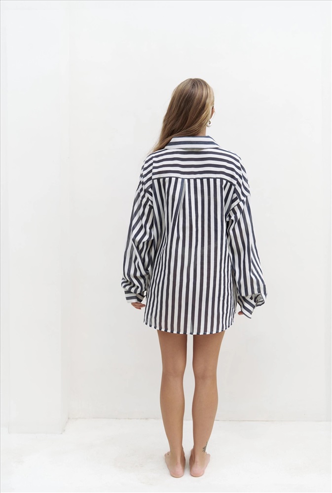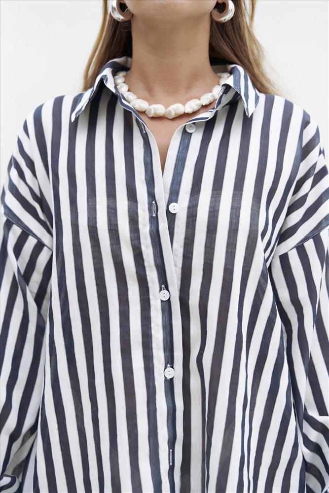 Рубашка оверсайз в полоску из хлопчатобумажной пряжи. Длинные рукава с воротником и манжетами.