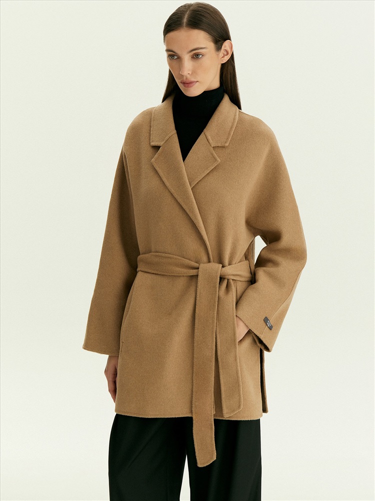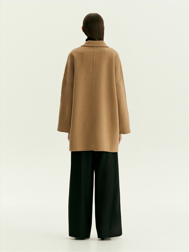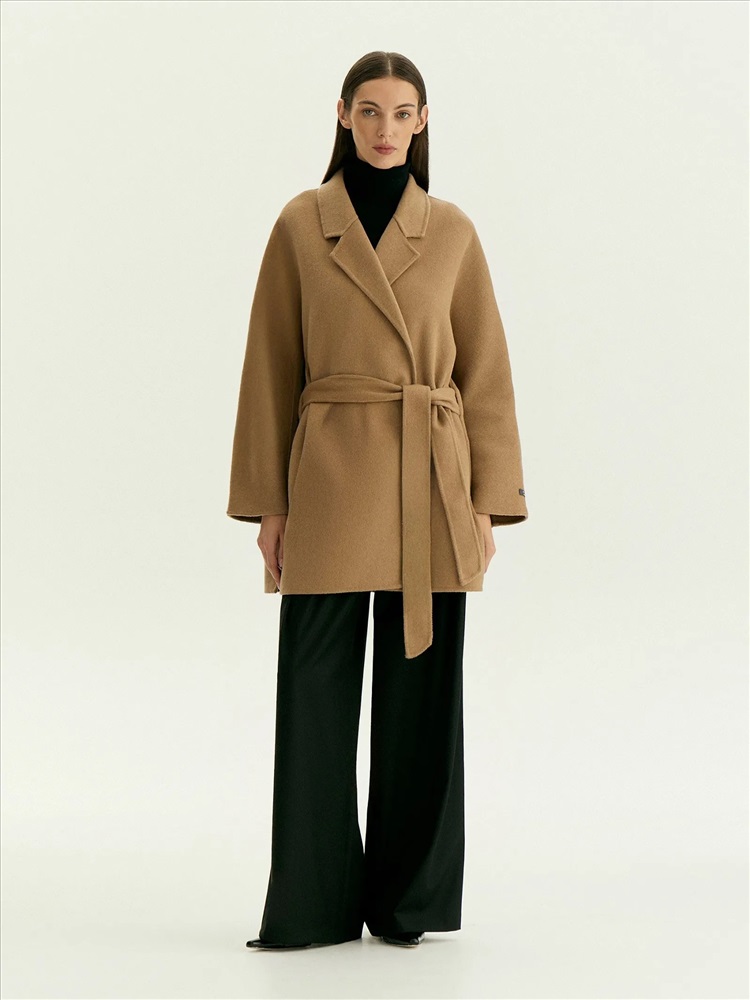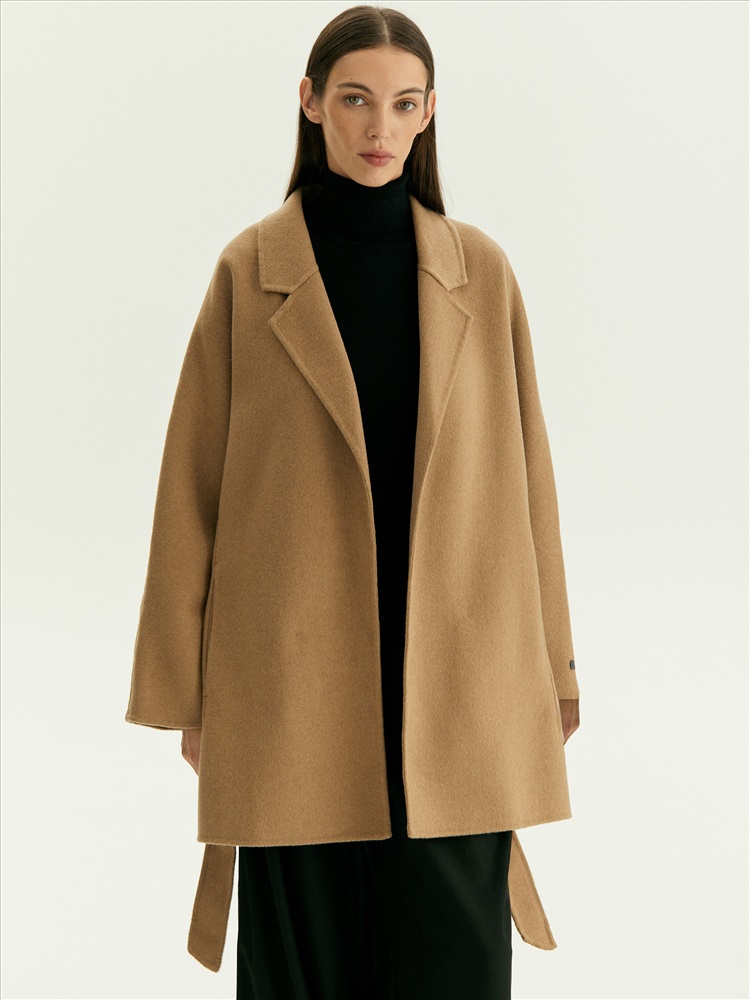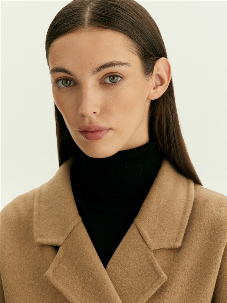 Элегантное манто в бежевом цвете смотрится современно и необычно. По бокам имеются разрезы. Предусмотрены специальные прорези для пояса. Материал более чем на 2/3 состоит из натуральной шерсти высокого качества и выполнен по технологии double-face: благодаря этому он дорого выглядит и отлично держит форму. Соединяли детали и прошивали пальто вручную: премиальное исполнение подтверждает вшивной ярлык hand made на рукаве. Пальто рассчитано на температуры до +5°C. Сделано без подкладки.