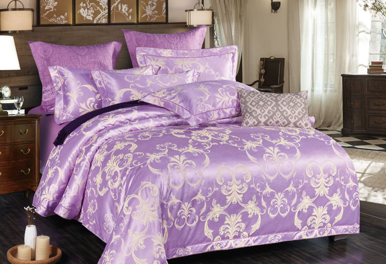 Ткань: Основной- Сатин жаккард 50% хлопок + 50% п/э; компаньон - Сатин 100% хлопок плотность 120-125гр Отделка: Наволочки и пододеяльник на молнии. Комплекты выполнены без декоративных бордюров, оборок и кружев! Размеры: 1,5 сп (2 нав), 2-х сп Евро (2 нав. 70х70), 2-х сп Евро (4 нав), Евро (4 нав), Семейный (4 нав) 1,5 сп (2 нав): пододеяльник 215х150 (на молнии) (+-2см) - 1штпростыня 215х153 (+-3см)- 1штнаволочка 70х70 (на молнии) (+-1см) - 2шт 2-х сп Евро (4 нав): пододеяльник 215х180 (на молнии) (+-2см) - 1штпростыня 240х220 (+-3см) - 1штнаволочка 70х70 (на молнии) (+-1см) - 2штнаволочка 70х50 (на молнии) (+-1см) - 2шт Внимание! Цена зависит от размера