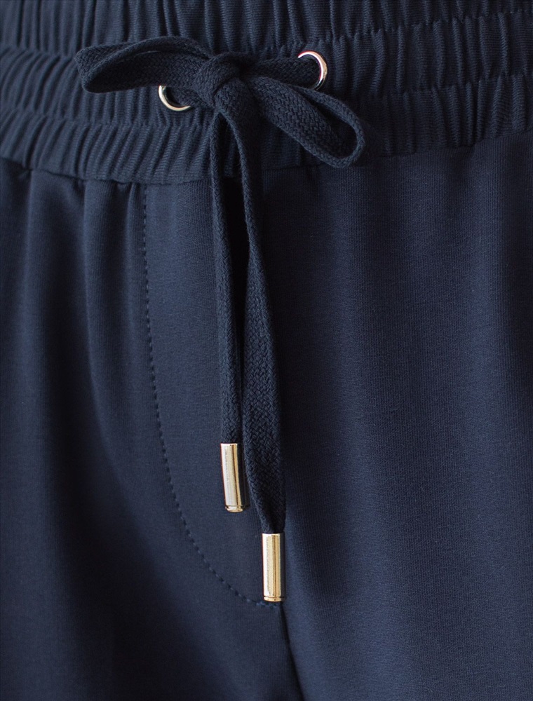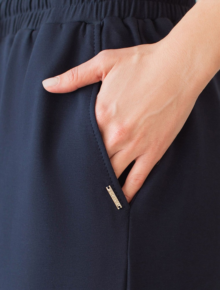 Брюки выполнены из футера двухнитки с эластаном. Модель прямого кроя дополнена боковыми карманами и одним задним карманом. Пояс выполнен из эластичного трикотажа в рубчик. В пояс вставлен плоский хлопковый шнур в тон изделия с золотистыми наконечниками. Изделие дополнено металлическим логотипом бренда. Сочетается в костюме с жакетом D49.078, джемпером D49.079, D49.080 и футболкой D49.081