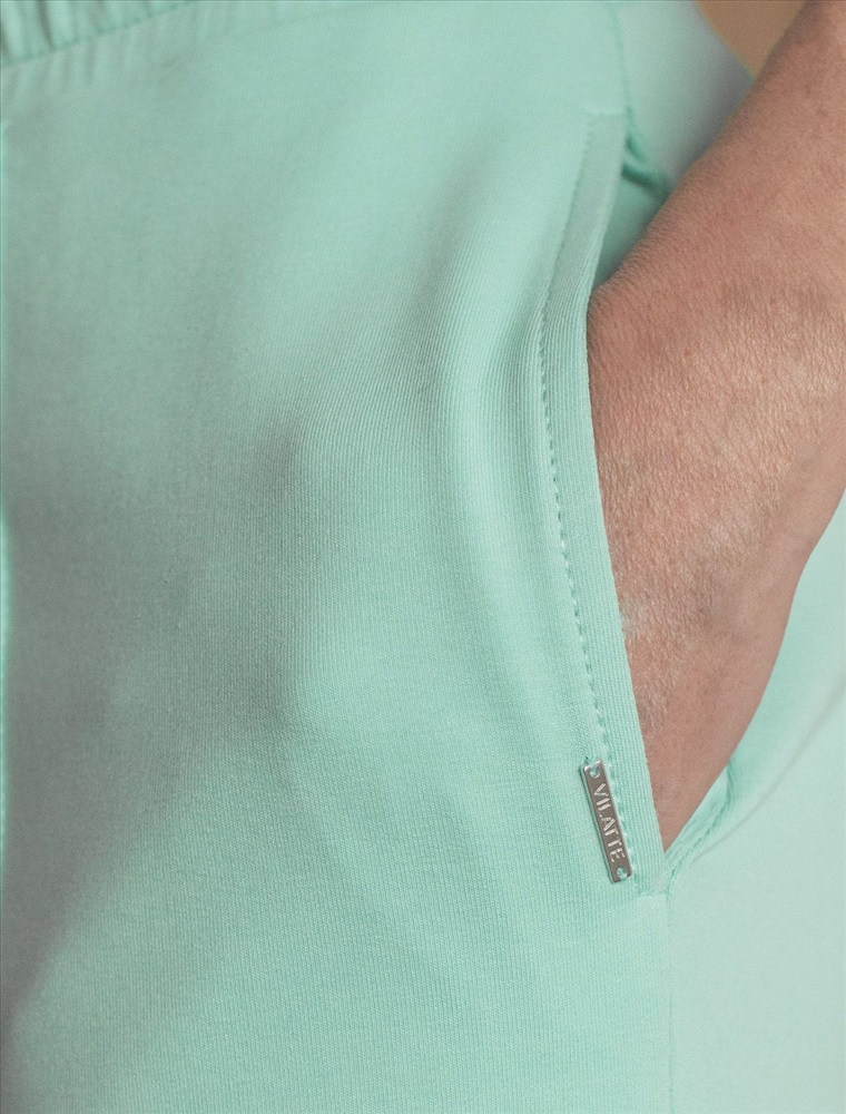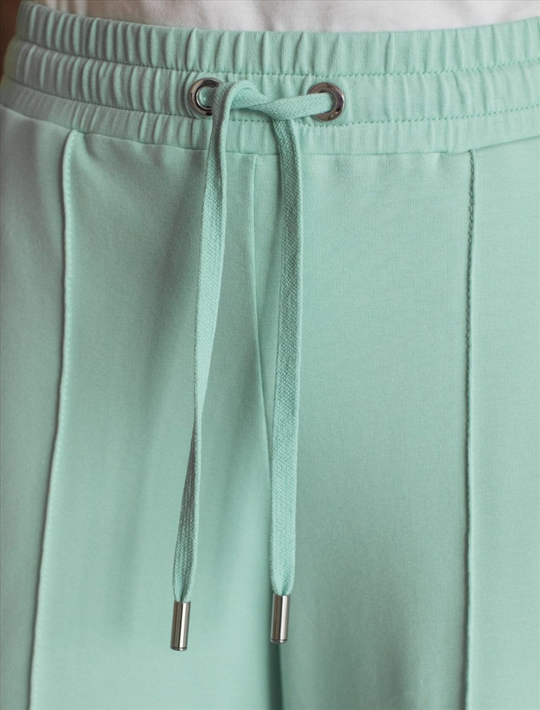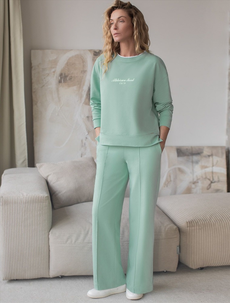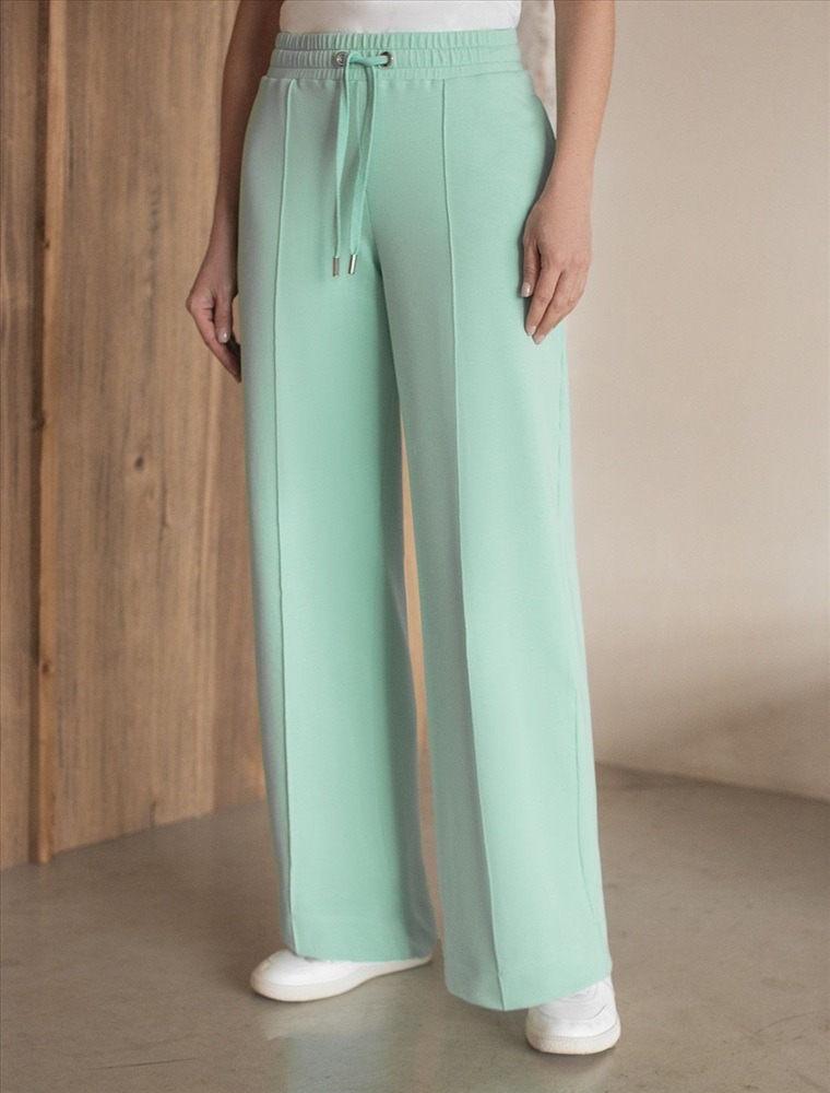 Плотность: 240 Г/м2 Брюки мятного цвета прямого кроя выполнены из премиального футера-двухнитки. Лаконичный силуэт поддерживают застроченные стрелки, зрительно вытягивающие силуэт. Удобный пояс на резинке регулируется хлопковым шнурком с золотистой фурнитурой. Наличие эластана в составе изделия гарантирует комфорт и долговечность изделия. Эластичный материал хорошо пропускает воздух, позволяя телу дышать, и легко тянется, не ограничивая движения. Эти уютные брюки созданного для вашего комфорта. Нежный и стильный вариант подходит на любую фигуру, благодаря своей идеальной посадке. Свободный прямой крой обеспечивает свободу движений и максимальное удобство в любых ситуациях, поэтому они подойдут и на большие размеры, включая 56 размер. Стильный расклешенный крой добавляет изюминку в ваш образ. Эти брюки универсальны и могут стать отличным вариантом, как для занятий, так и для повседневной носки. Они легко вписываются в повседневный образ, благодаря универсальности и элегантности. Достоинства фигуры подчеркиваются, а силуэт визуально вытягивается за счет кроя палаццо и стрелок. В этих спортивных брюках вы будете чувствовать себя комфортно и уверенно, наслаждаясь каждым моментом дня. Рекомендуем сочетать с артикулами: D49.160, D49.168 Комментарии к товару