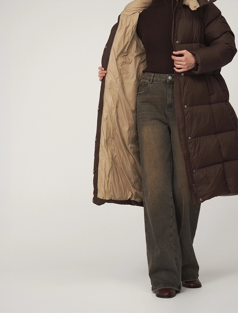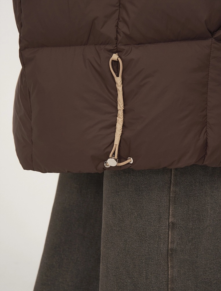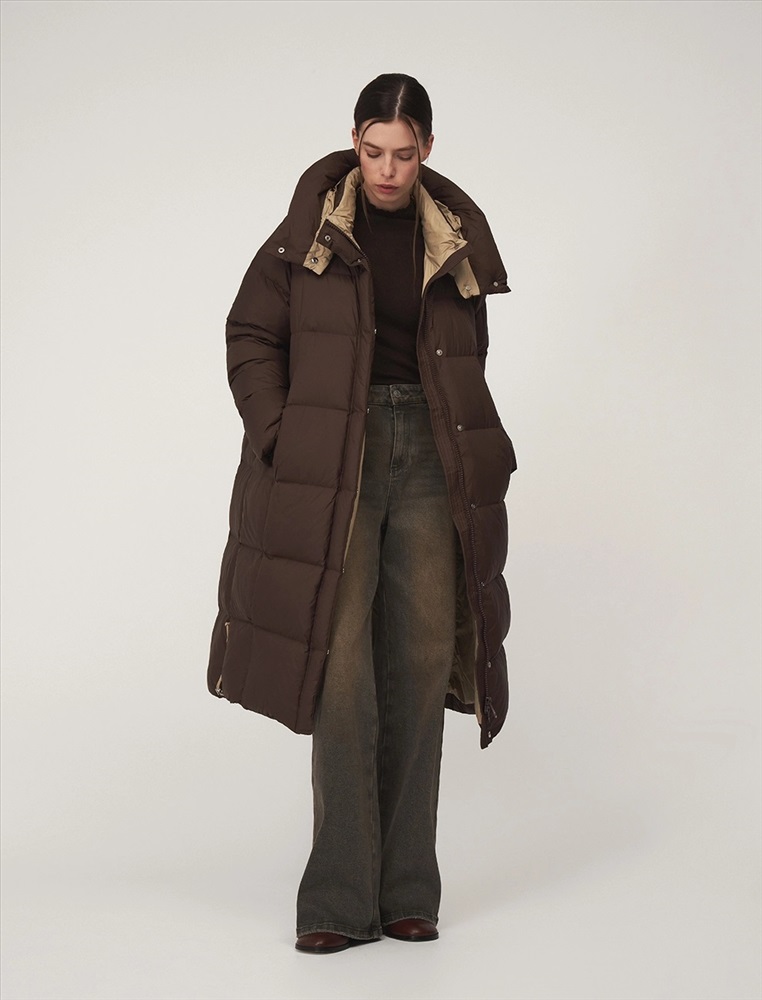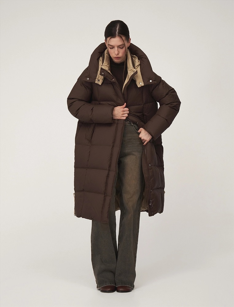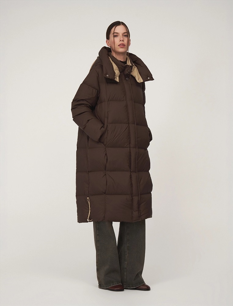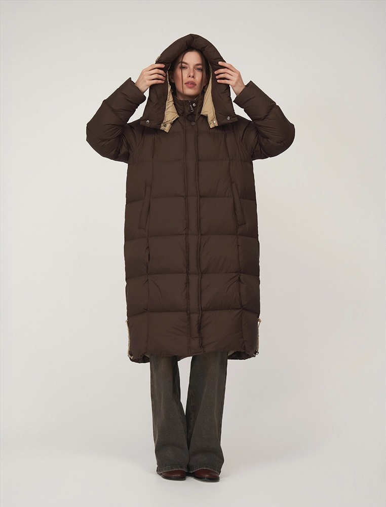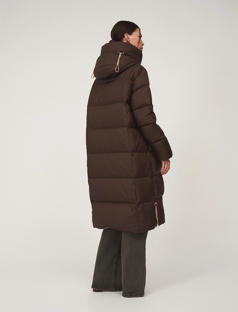 Пуховик прямого силуэта длиной до уровня ниже колена. Высокий воротник и капюшон защищают от ветра. По передней части планка с застежкой на кнопки и молния с двумя пуллерами. По бокам врезные карманы с листочкой. По низу и на капюшоне затяжники с фиксаторами. В составе утеплителя утиный пух (90%) и утиное перо. Представлен в коричневом оттенке с контрастной бежевой подкладкой.