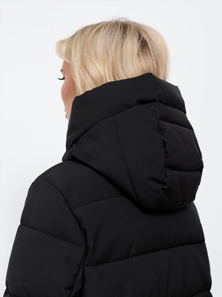Длинный стильный пуховик прямого кроя с глубоким капюшоном.