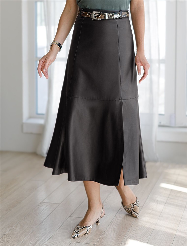 Стильное решение для смелых и уверенных образов. Юбка черного цвета, свободного кроя с плавные волнами на ткани, создает эффектный силуэт, подчеркивая женственность и динамику движения. Пояс стандартной ширины с обтачкой из мягкой изнанки обеспечивает комфорт при носке, не сковывая движений. Небольшой разрез до колена добавляет лёгкую дерзость и удобство при ходьбе. Качественная искусственная кожа придает юбке благородный блеск и износостойкость, сохраняя при этом легкость и эластичность.