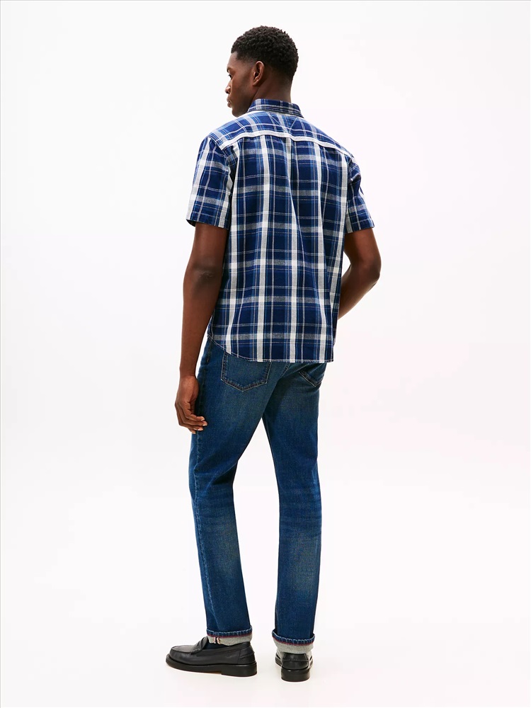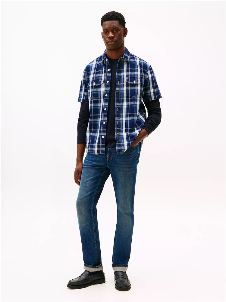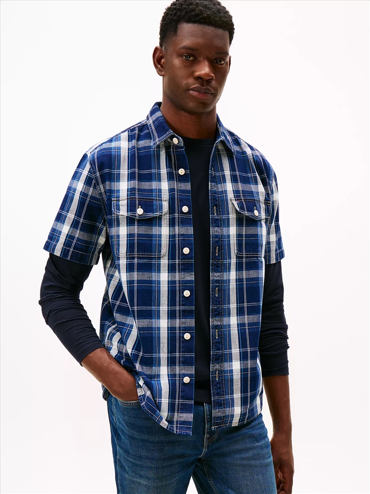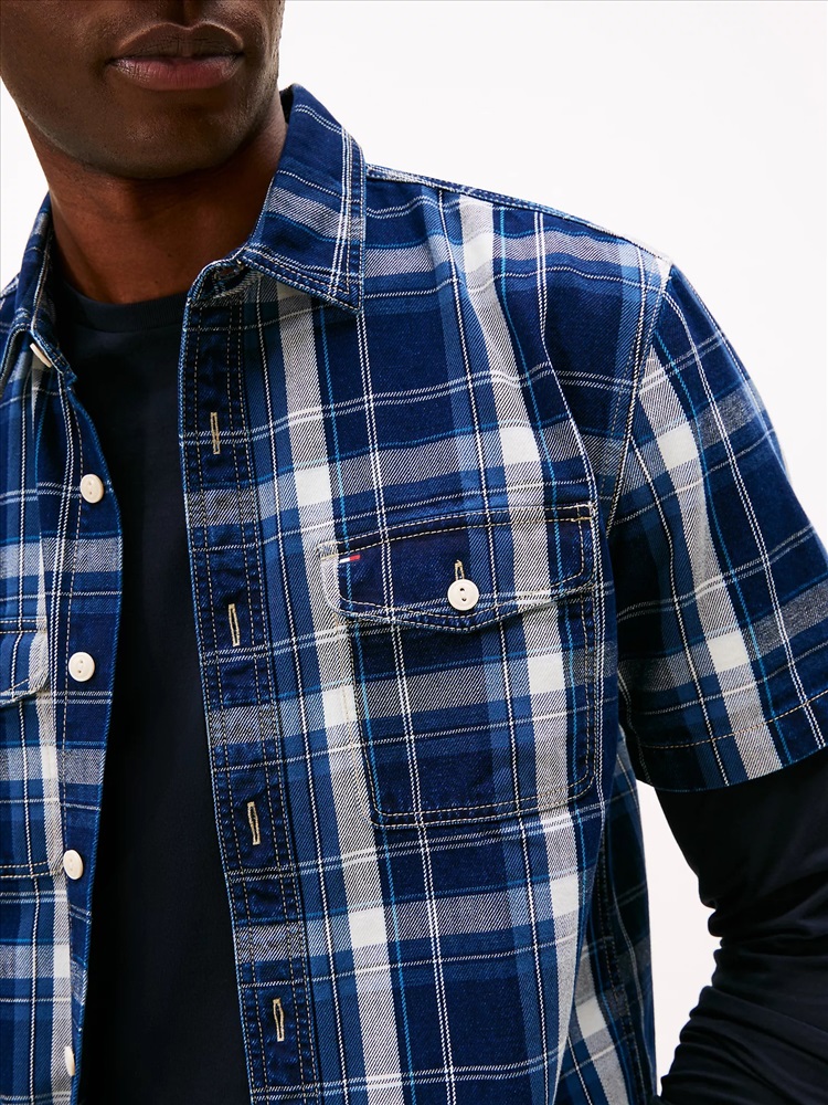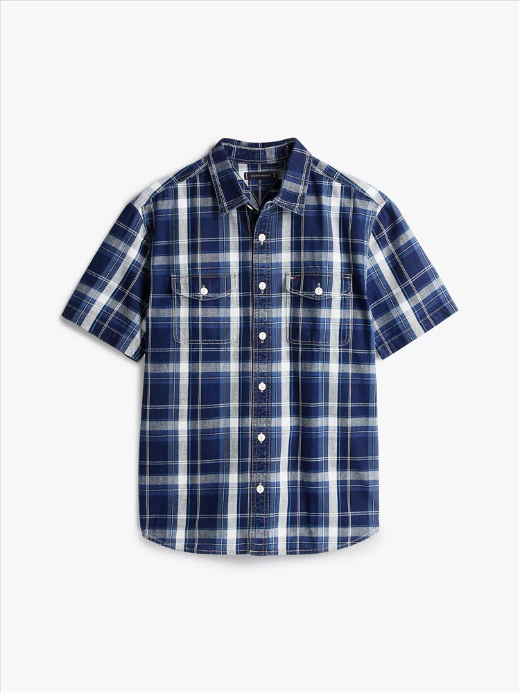 Tommy Hilfiger men's shirt. For a seamless transition from summer to fall, wear this short-sleeve denim shirt on its own or over a waffle-knit long-sleeve tee. Designed with two chest pockets and finished in a plaid print, this piece lends a rugged feel to your wardrobe.