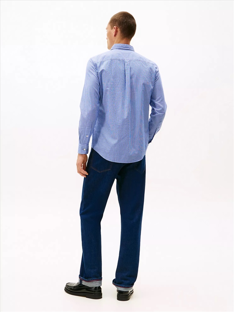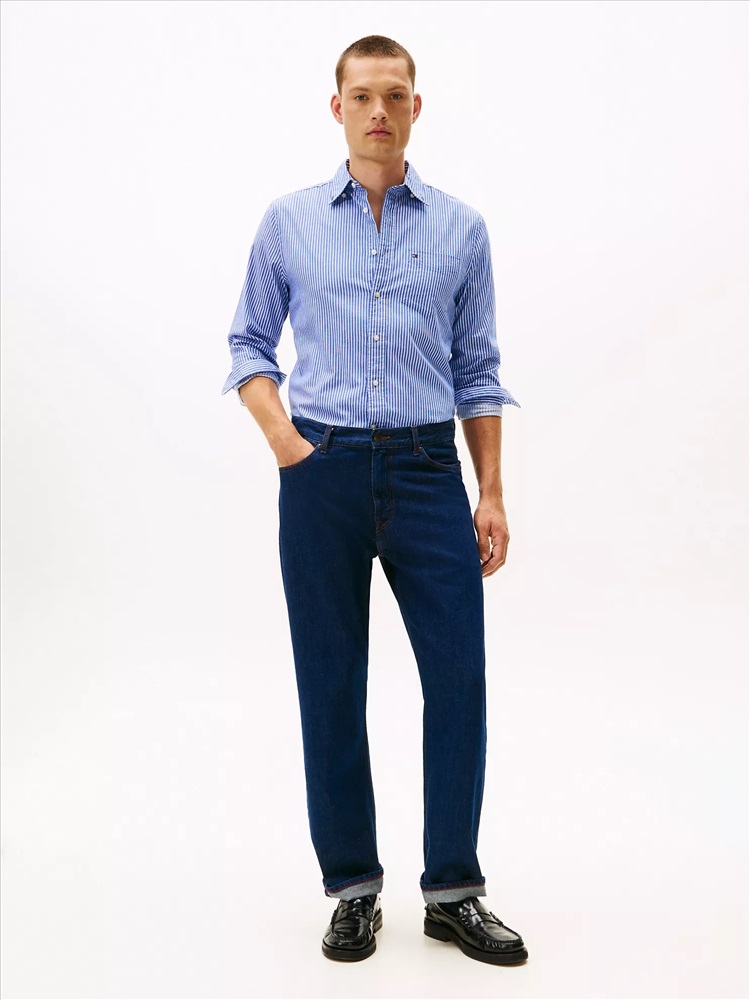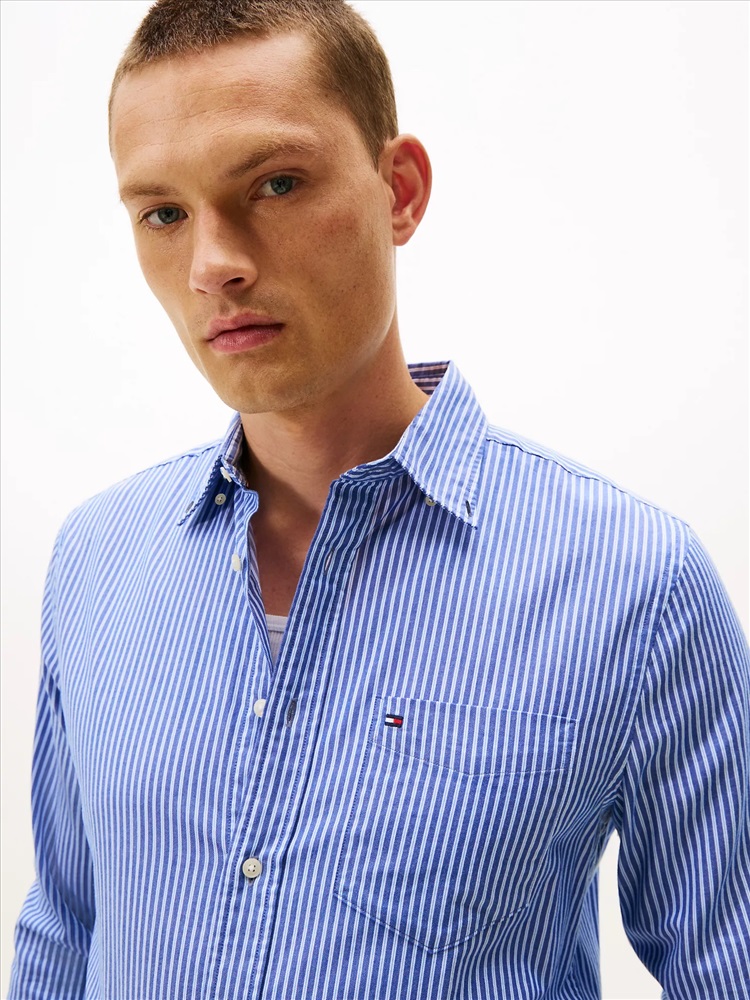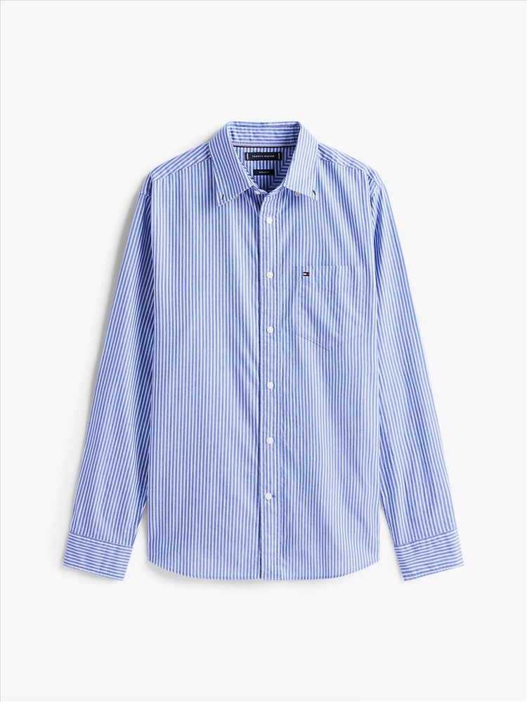 Tommy Hilfiger men's shirt. Update your wardrobe with this new-season stripe shirt, made from durable mercerized cotton twill in an easy fit.