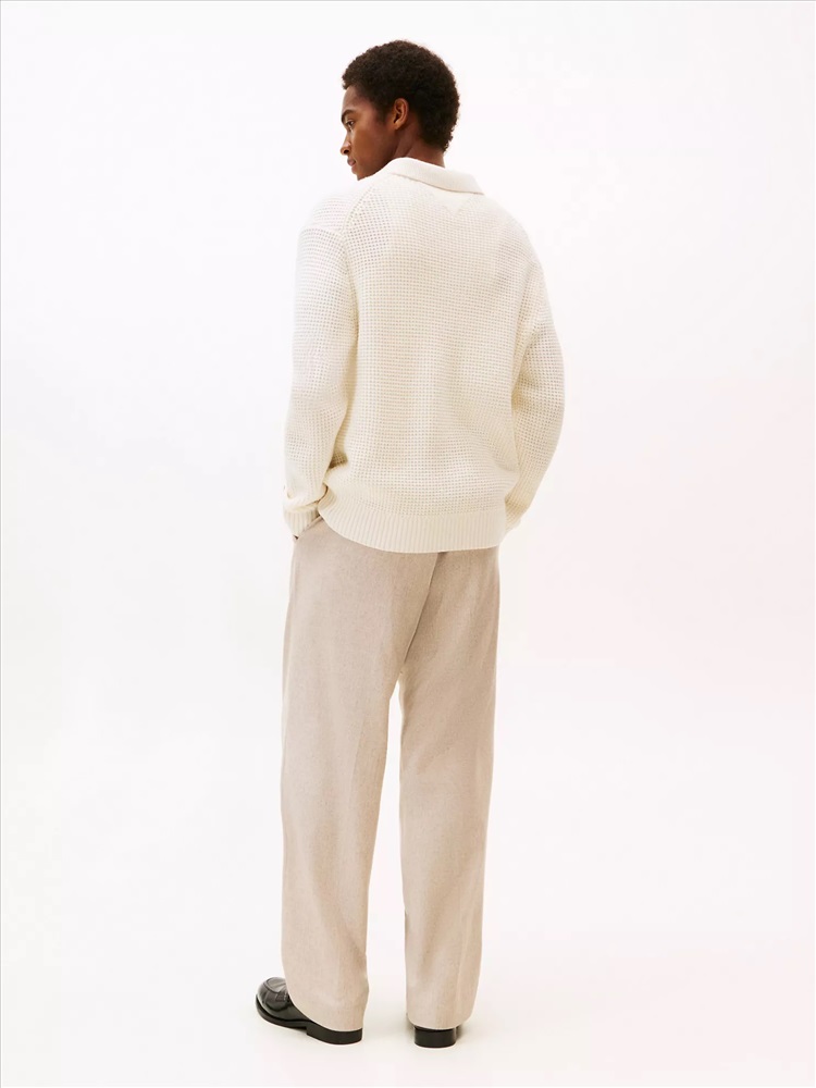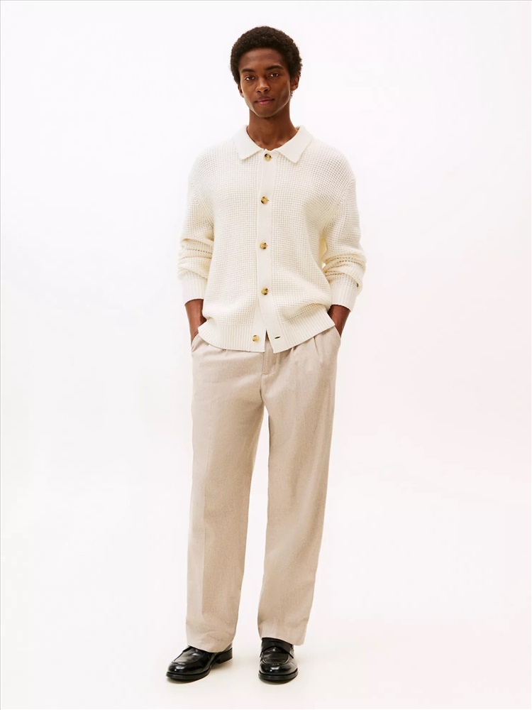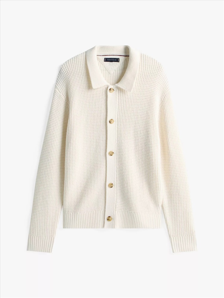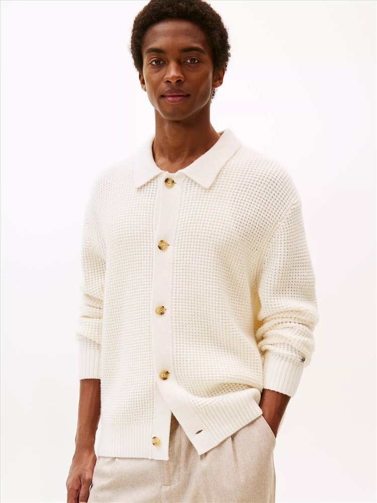 Tommy Hilfiger men's sweater. Add a stylish layer of warmth to your elevated-casual looks with this relaxed, button-up cardigan, knit from a cozy textured lambswool blend.