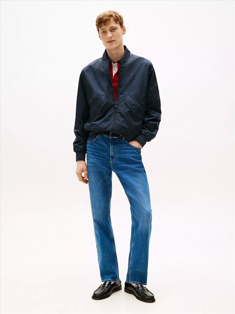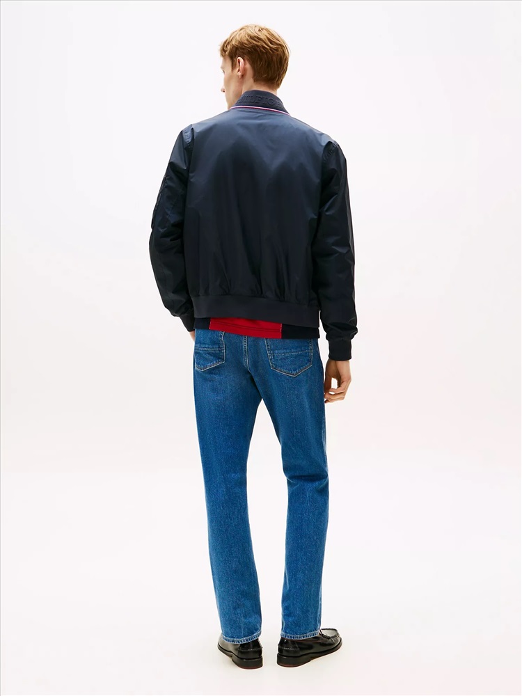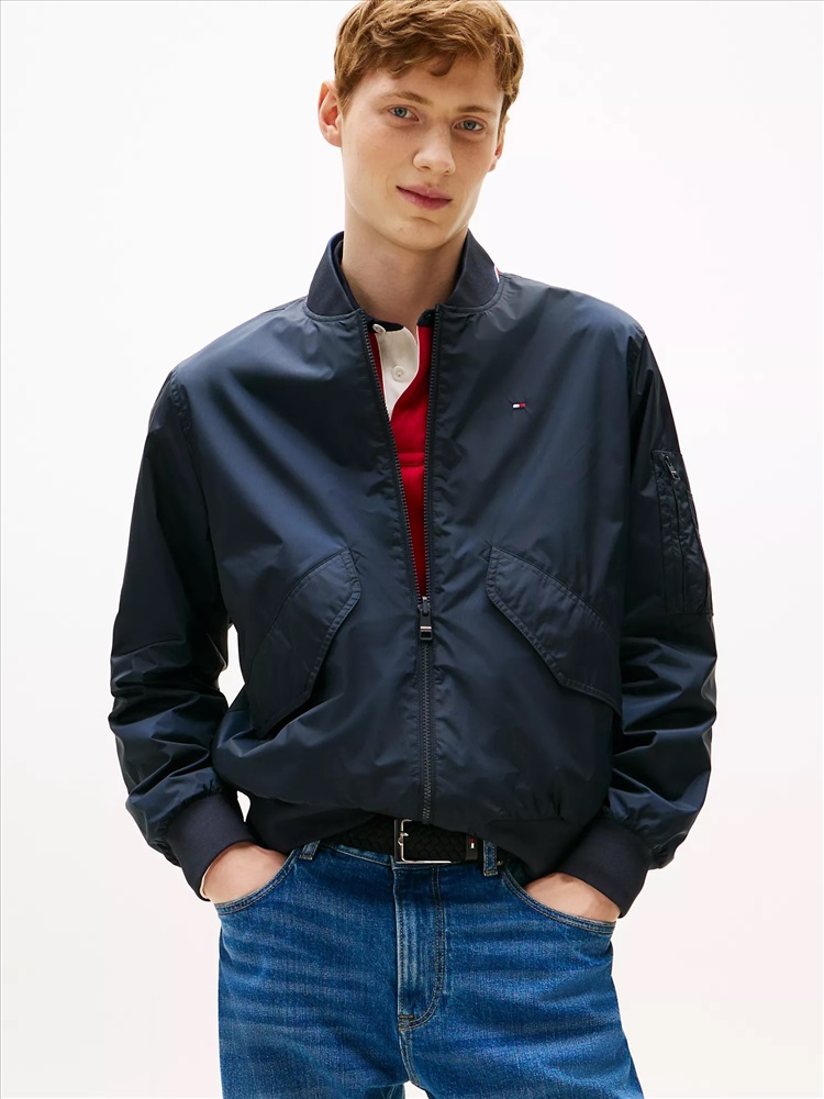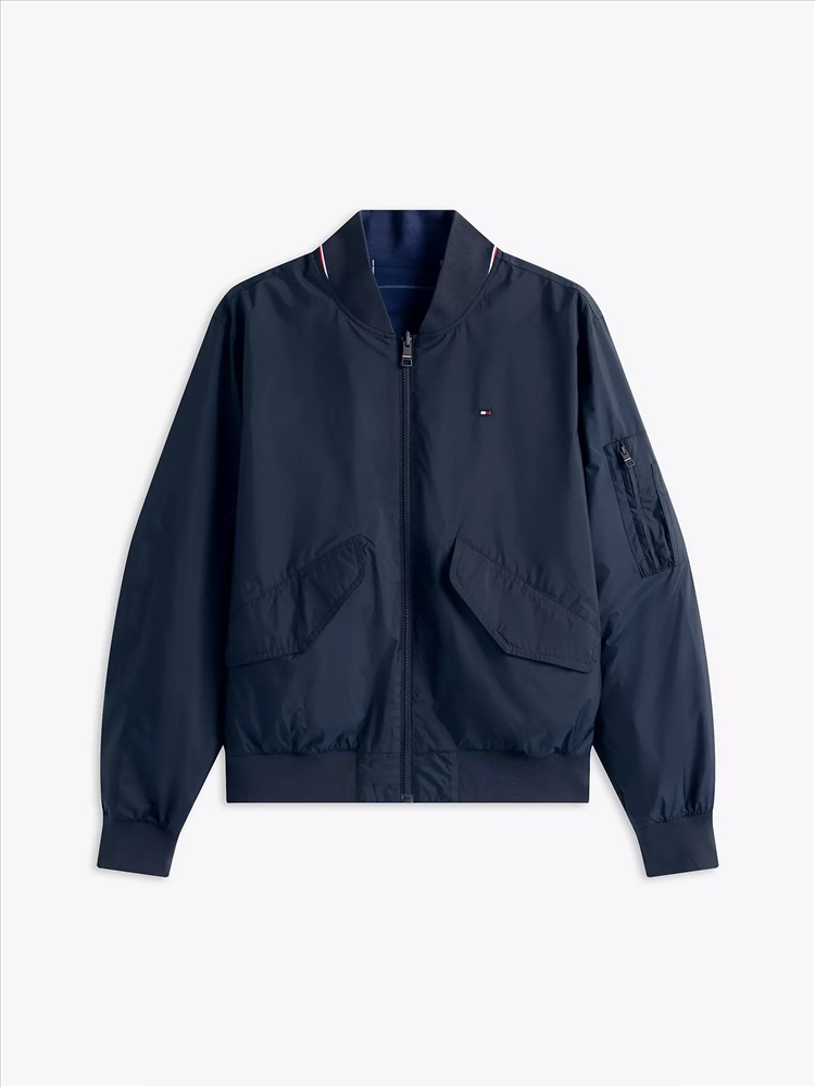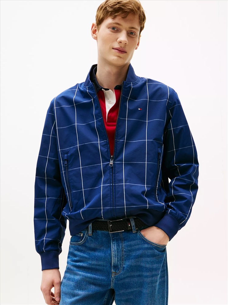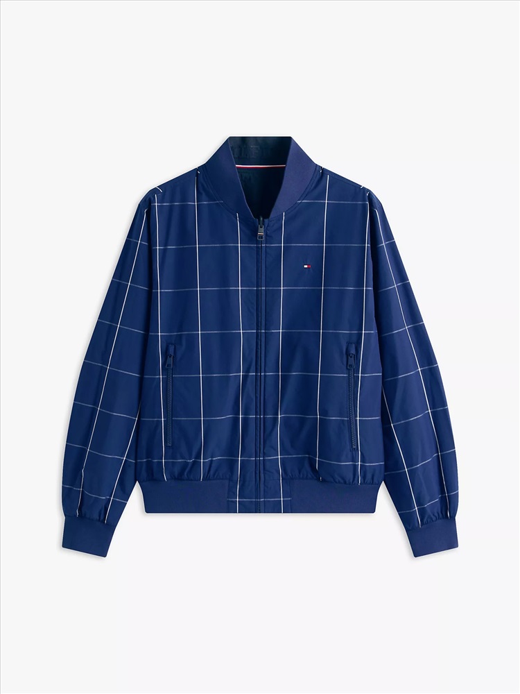 Tommy Hilfiger men's jacket. Our reversible bomber offers two style options in one silhouette. One side features a solid color with a zip pocket on the sleeve and our embossed logo at the collar. The other side is finished in a fresh windowpane check pattern.