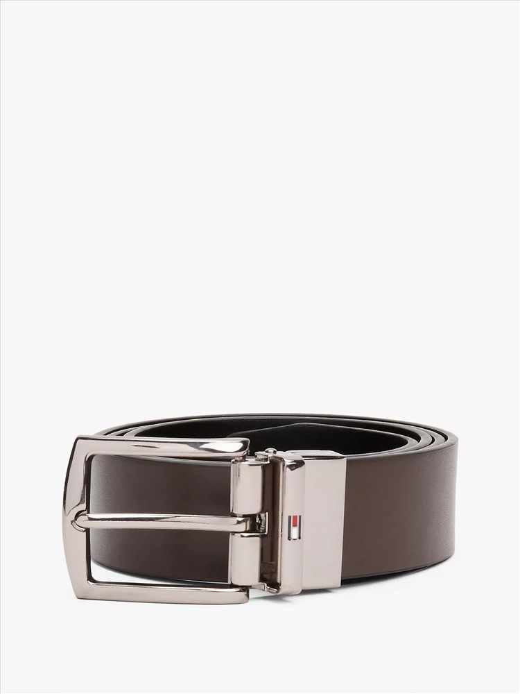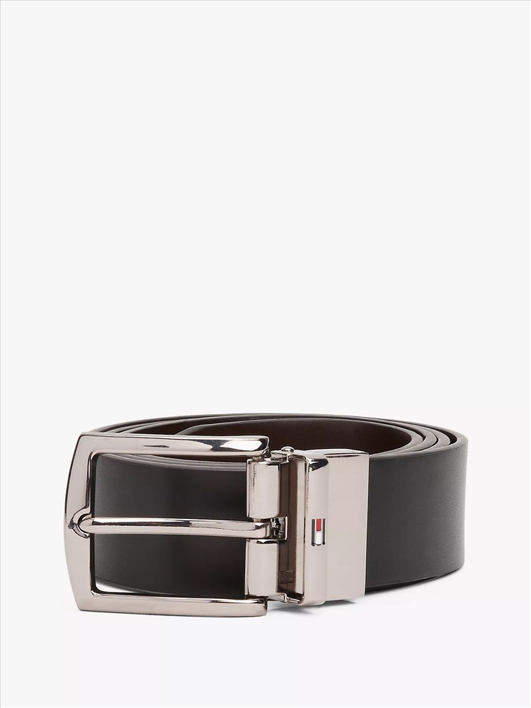 Tommy Hilfiger men's belt. Keep perfectly pulled together—our classic leather belt features a reversible stainless steel buckle and our iconic flag logo at the loop.