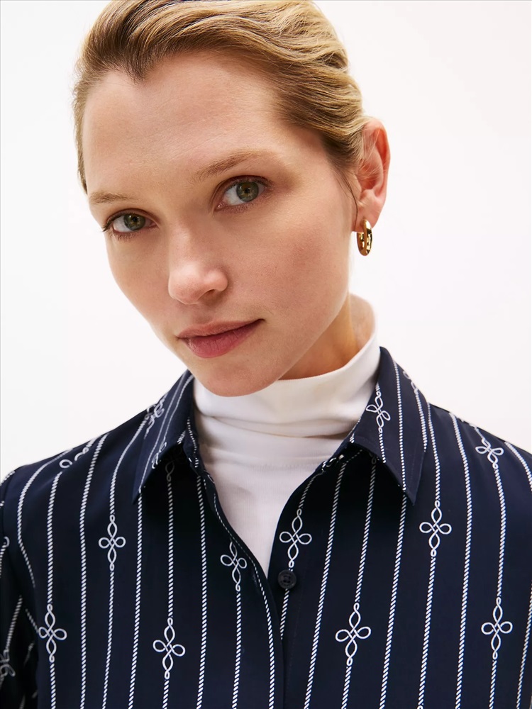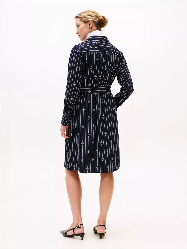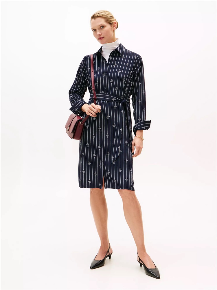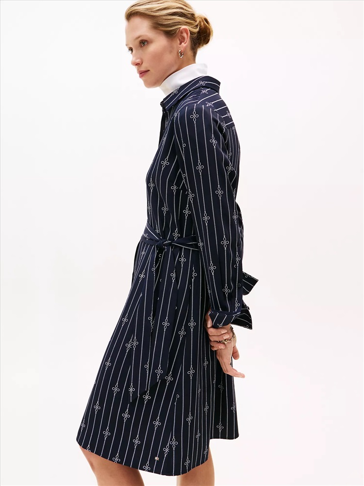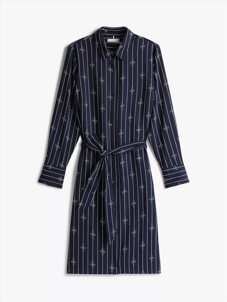 Tommy Hilfiger women's dress. Made from fluid crepe, our breezy long-sleeve shirtdress features our nautical rope print for maritime-inspired flair. Use the self-tie waist belt to personalize the fit.