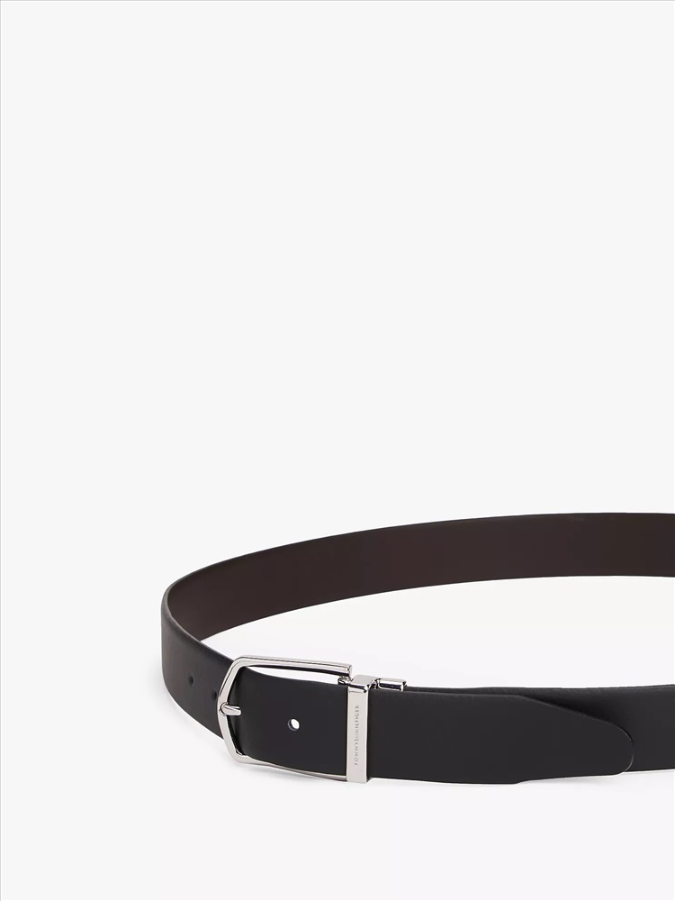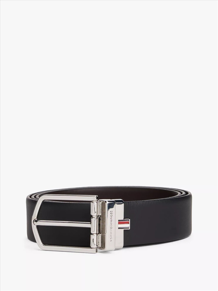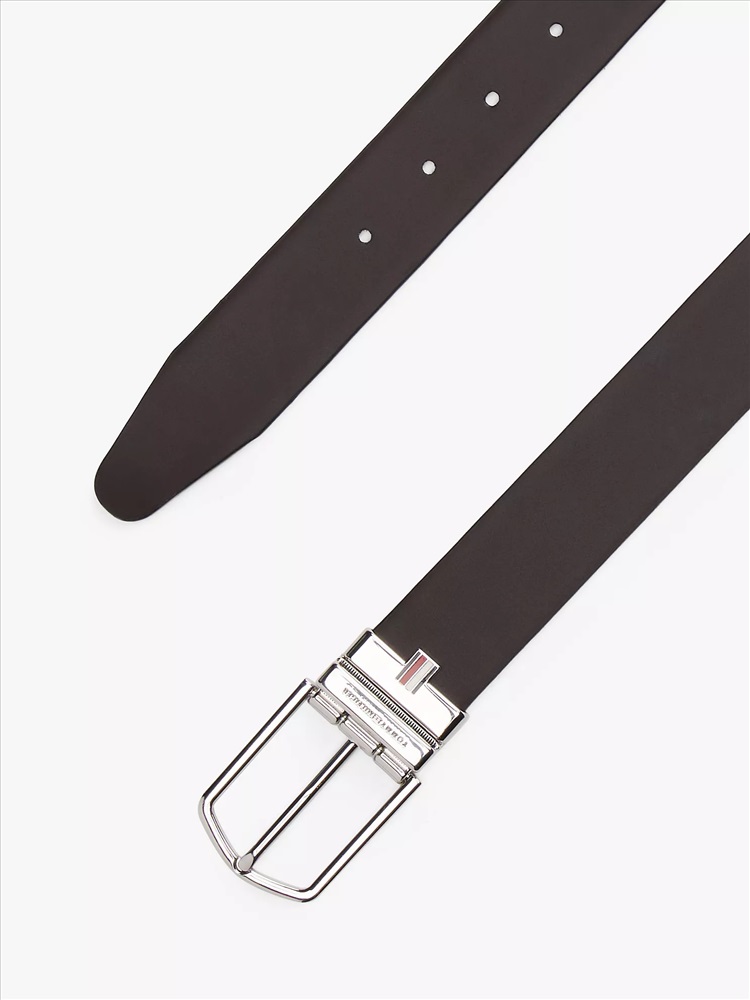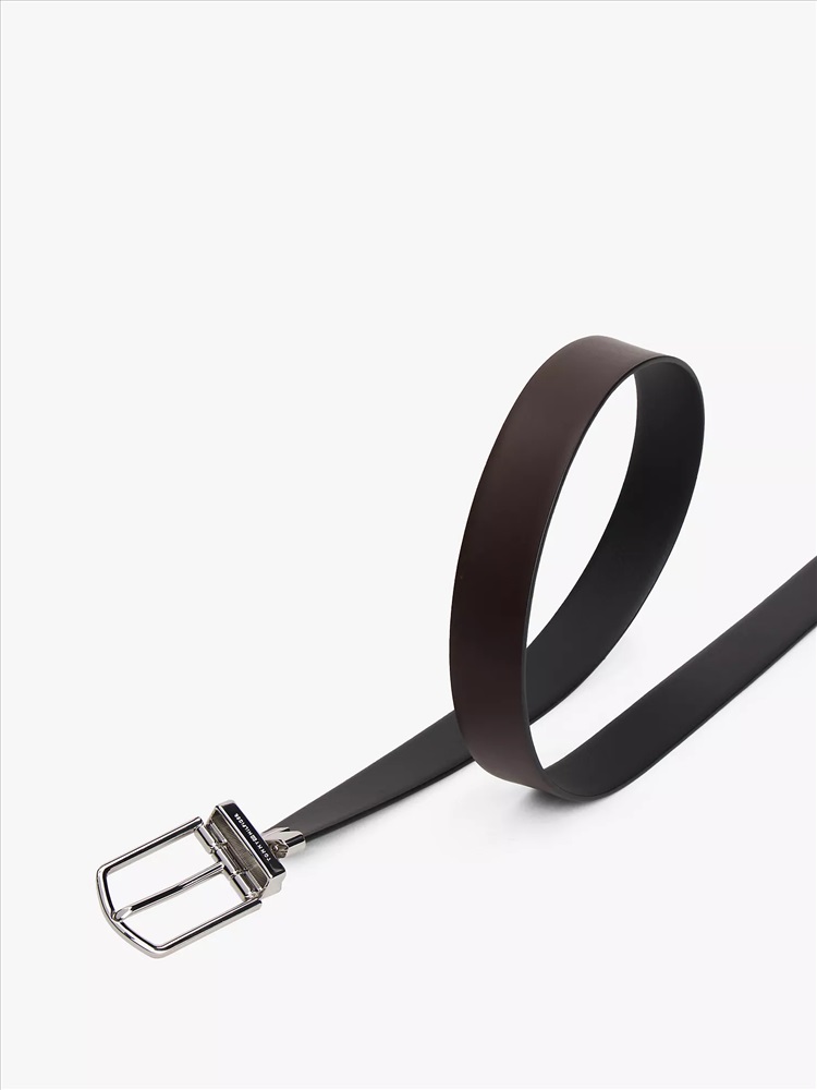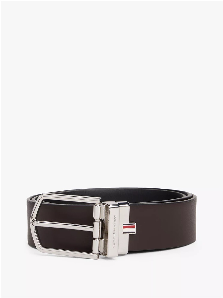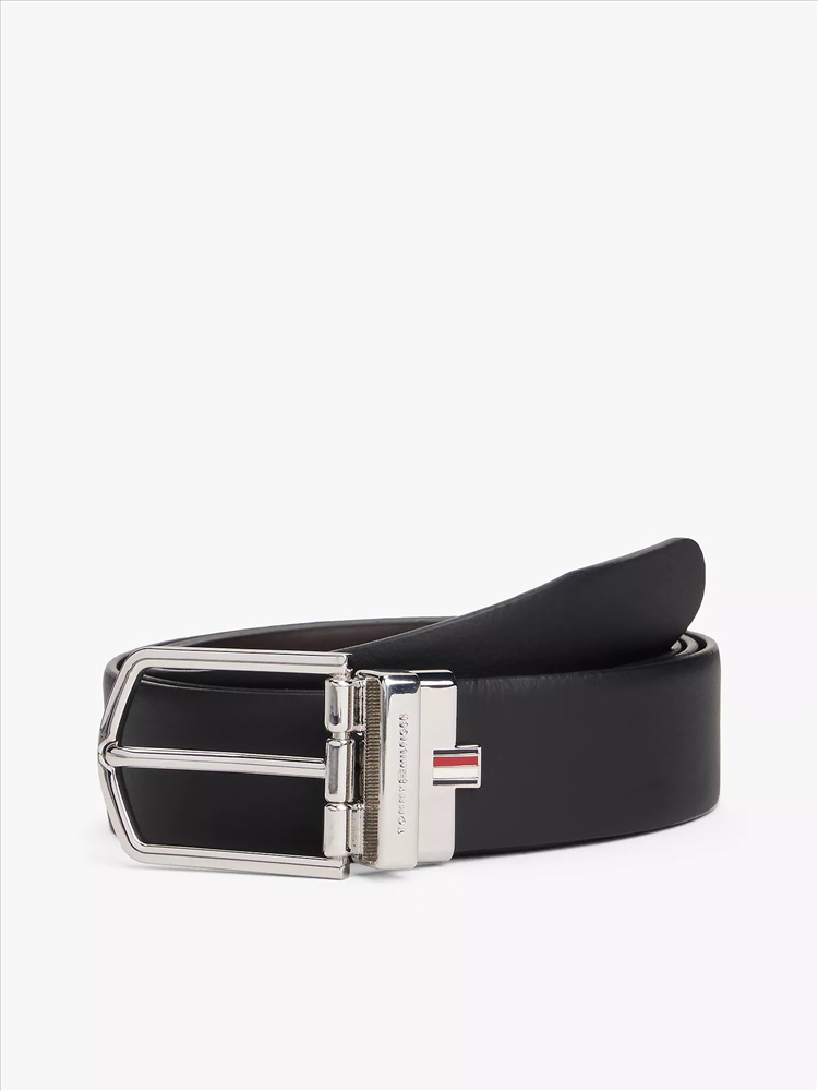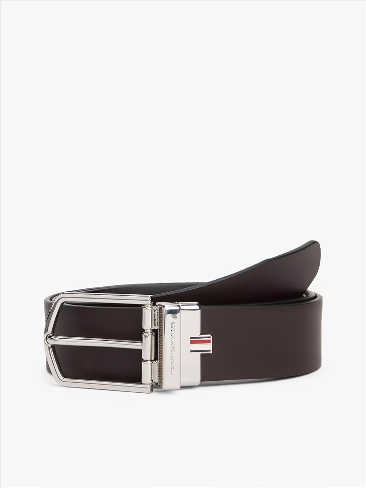 Tommy Hilfiger men's belt. What's better than one belt? Two belts in one — this innovative design features a reversible buckle that allows you to flip between a black and brown leather finish.
