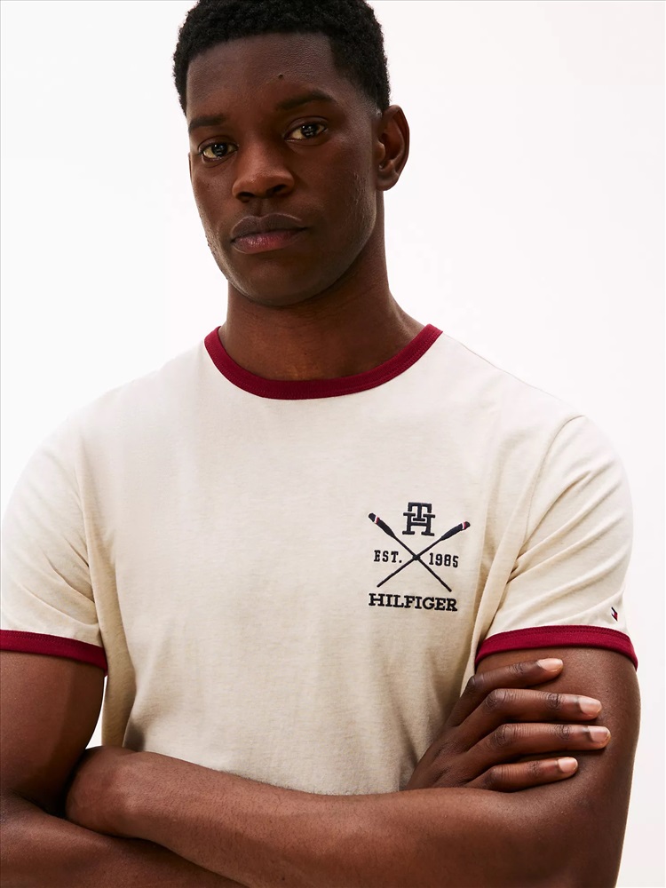 Tommy Hilfiger men's T-shirt. Our all-season, medium-weight tee is cut in a comfortable, easy fit from soft and stretchy cotton jersey. This version is finished with our sporty rowing crew logo.