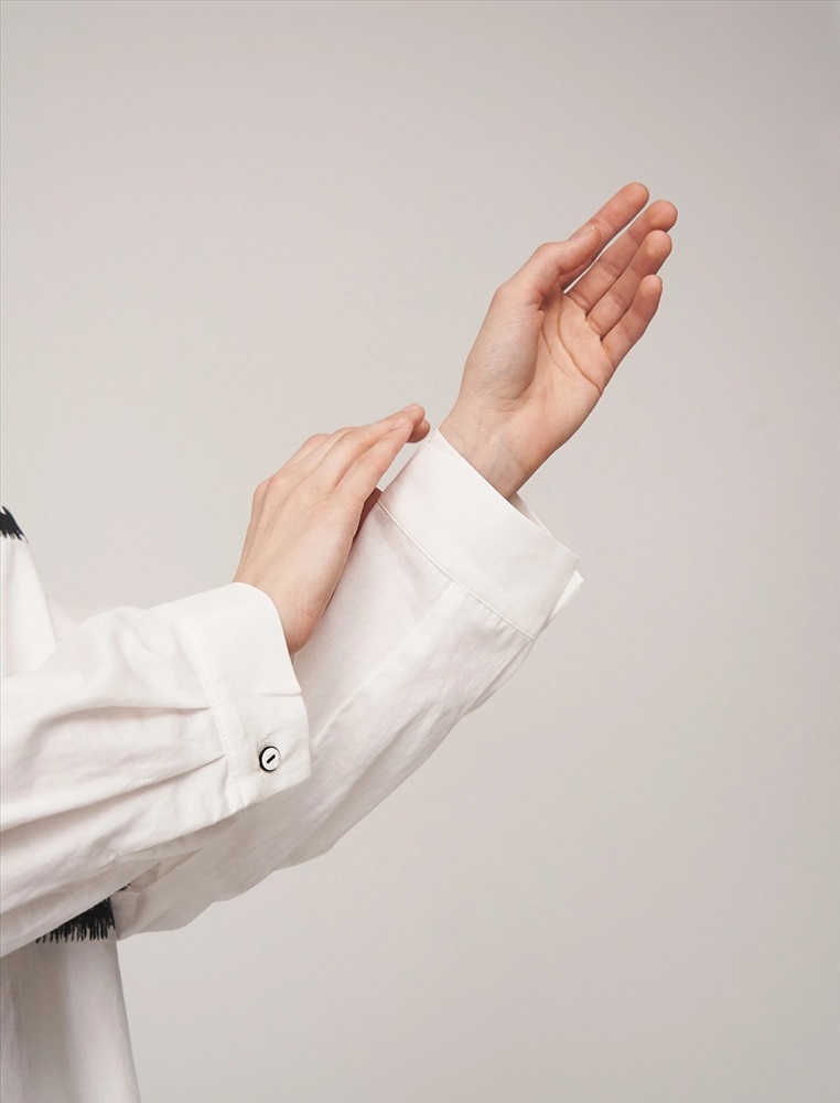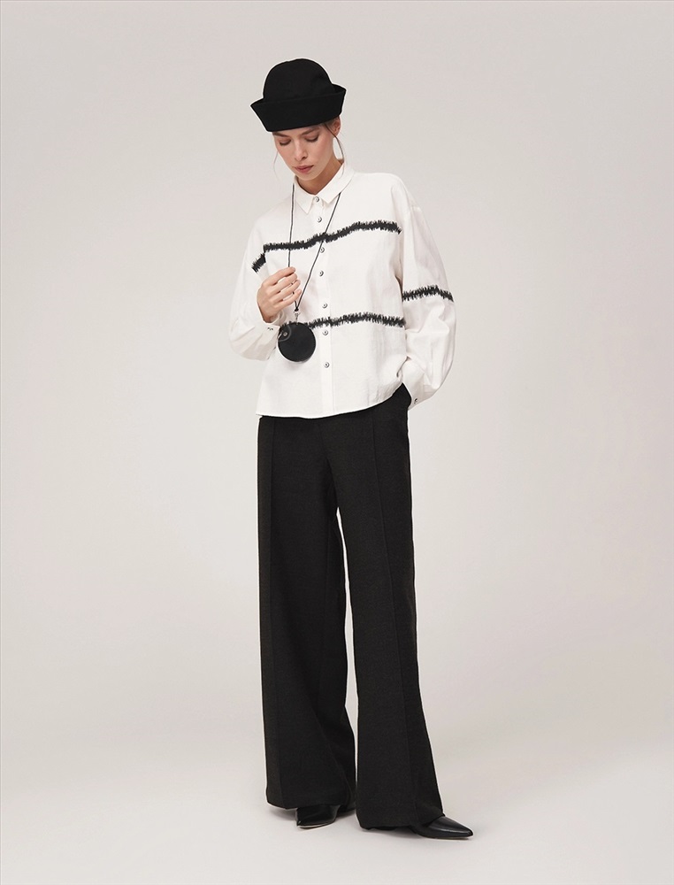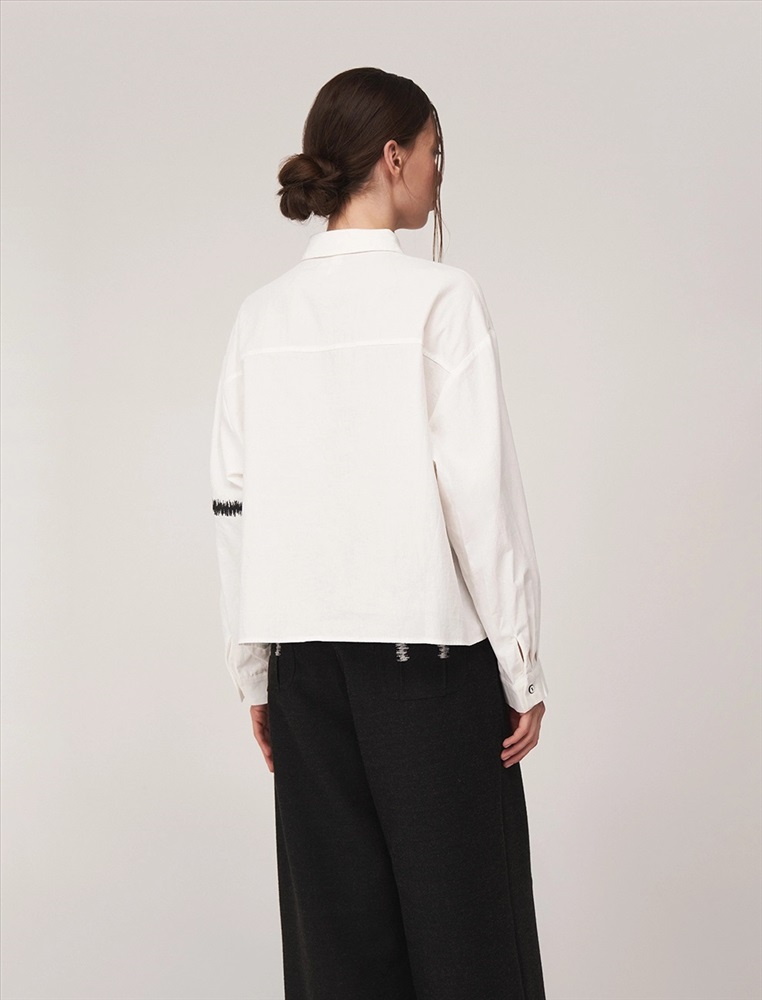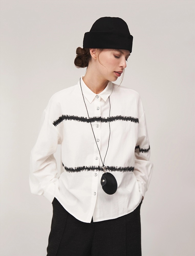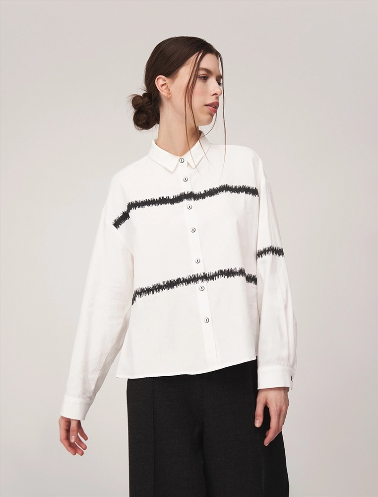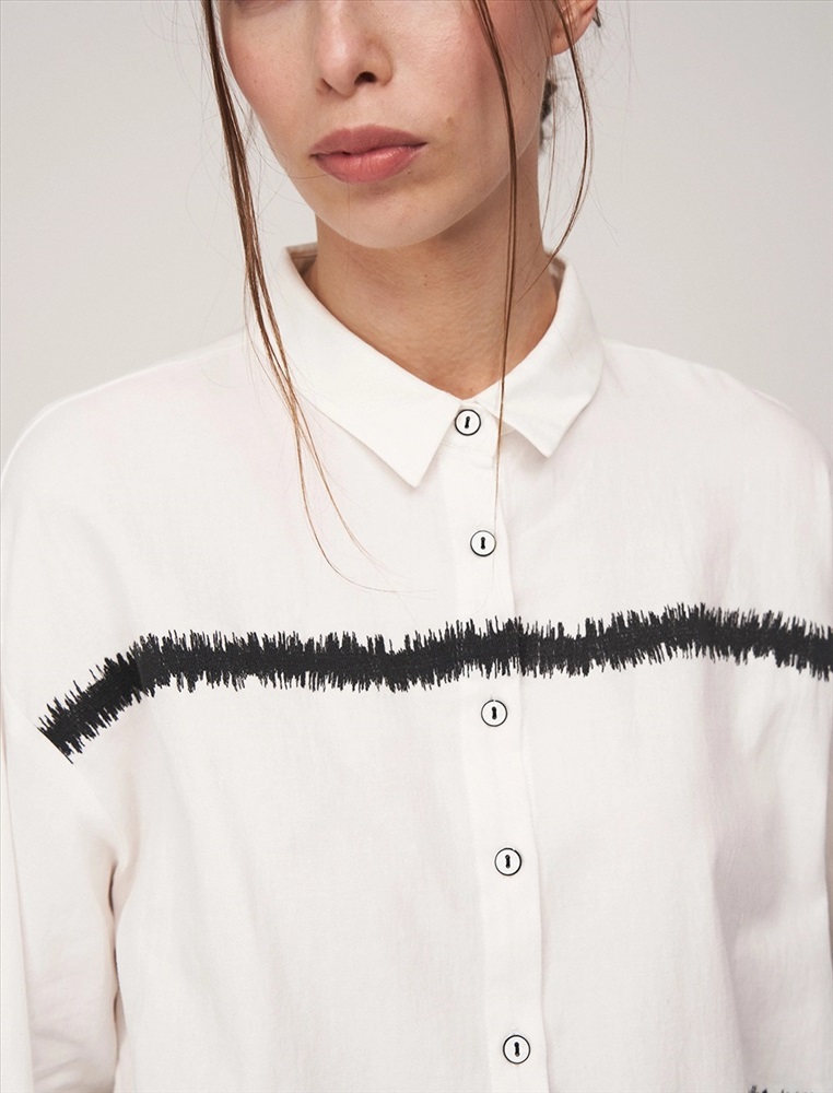 Рубашка регулярного силуэта со спущенной линией плеча. По горловине отложной воротник. По передней части изделия планка с застежкой на пуговицы и контрастный принт, переходящий на левый рукав. Выполнена из хлопка с небольшим добавлением полиэстера.