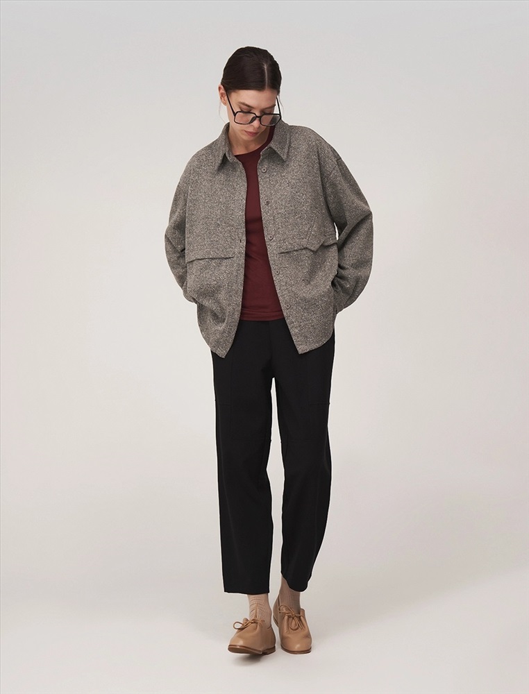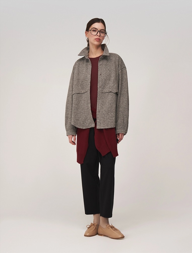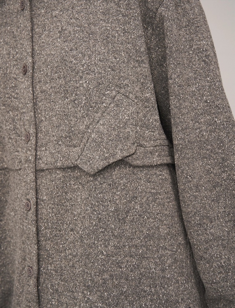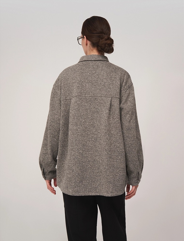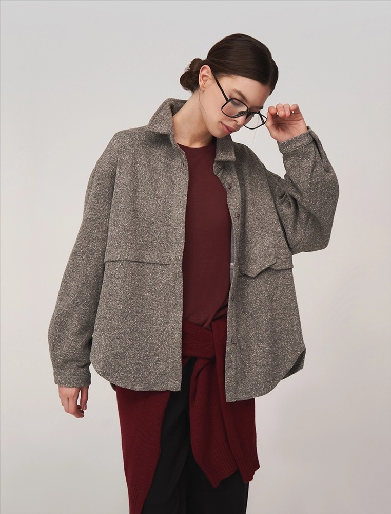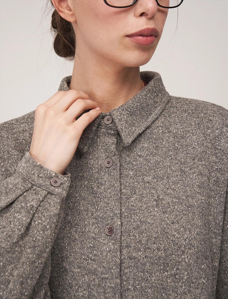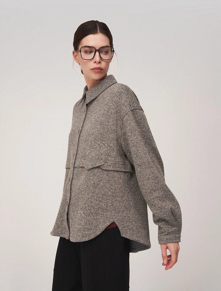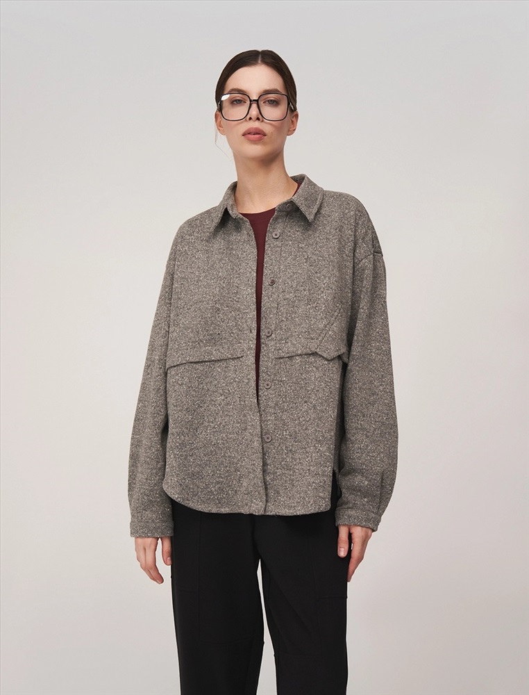 Рубашка регулярного силуэта со спущенной линией плеча. По горловине отложной воротник. По передней части планка с застежкой на пуговицы. Сзади кокетка и складки на уровне лопаток. На уровне талии горизонтальная планка, на которой, с левой стороны, по диагонали расположен декоративный карман с клапаном. Манжеты застегиваются на пуговицы. Выполнена из хлопка (60%), акрила и полиэстера. Представлена в сером меланже.
