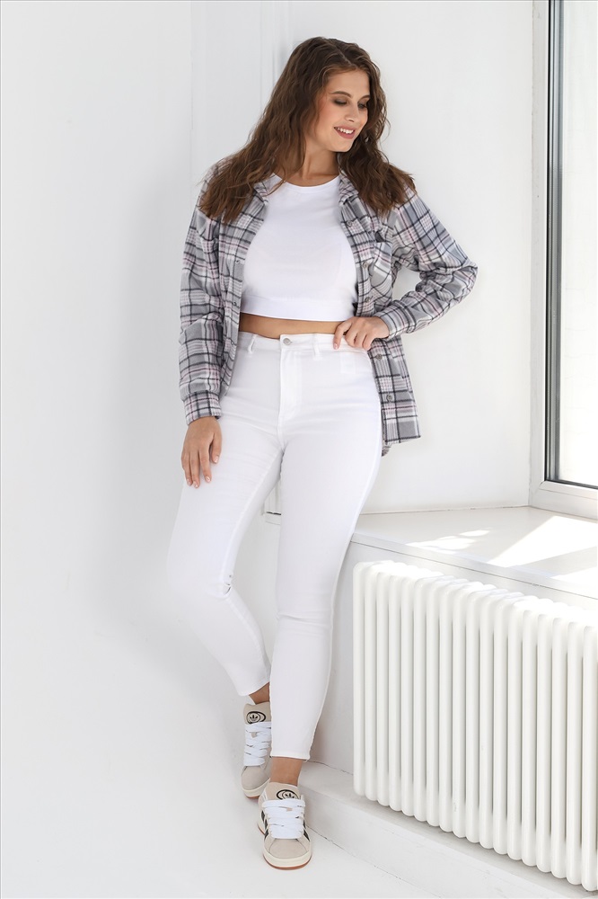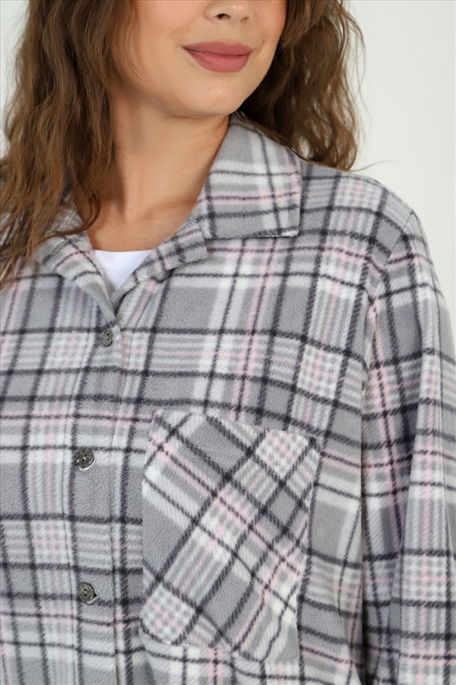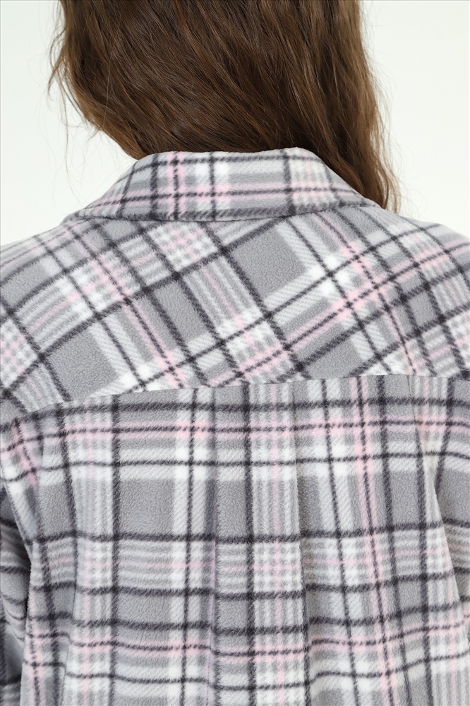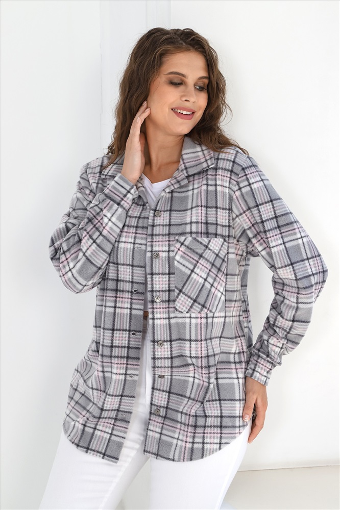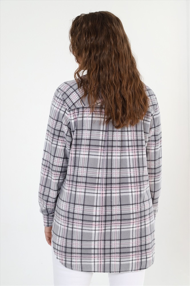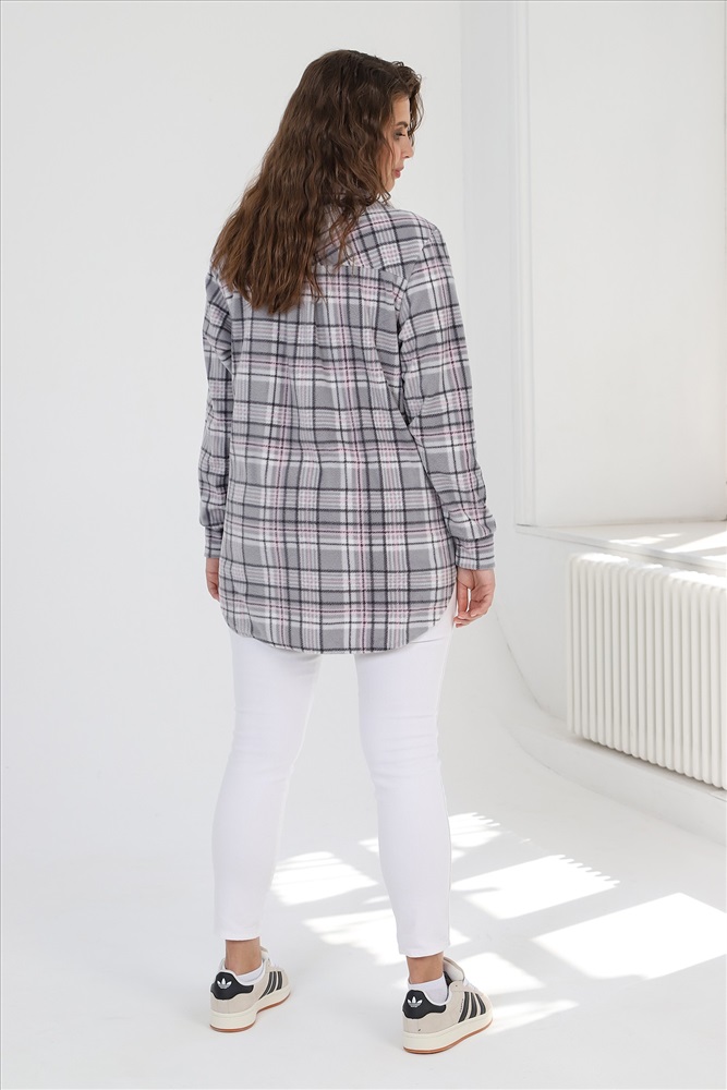 Рубашка (туника) женская из трикотажного полотна «флис» с рисунком в клетку, прямого силуэта, с длинными втачными рукавами на притачных манжетах, стояче-отложным воротником, нагрудным карманом, фигурным низом и центральной бортовой застежкой на петли и пуговицы. Спинка – с отрезной кокеткой и бантовой складкой в центре соединительного шва.