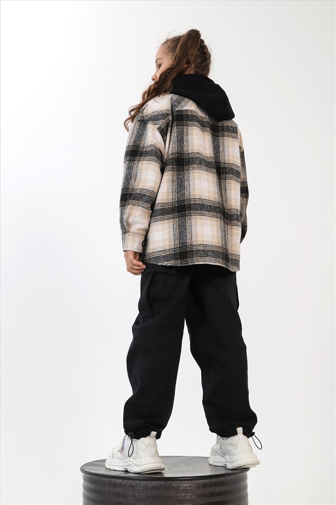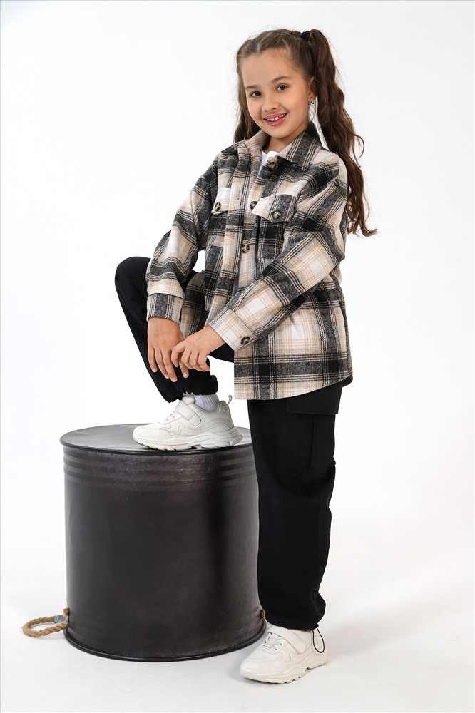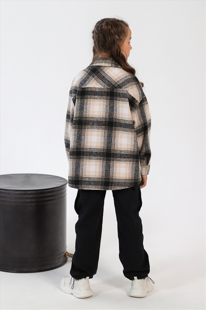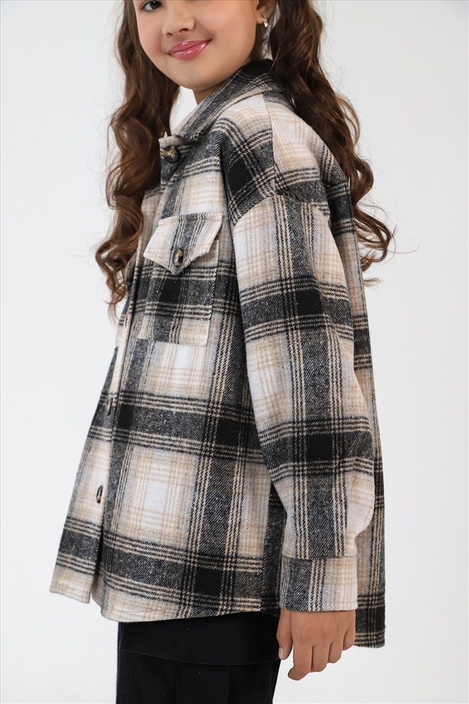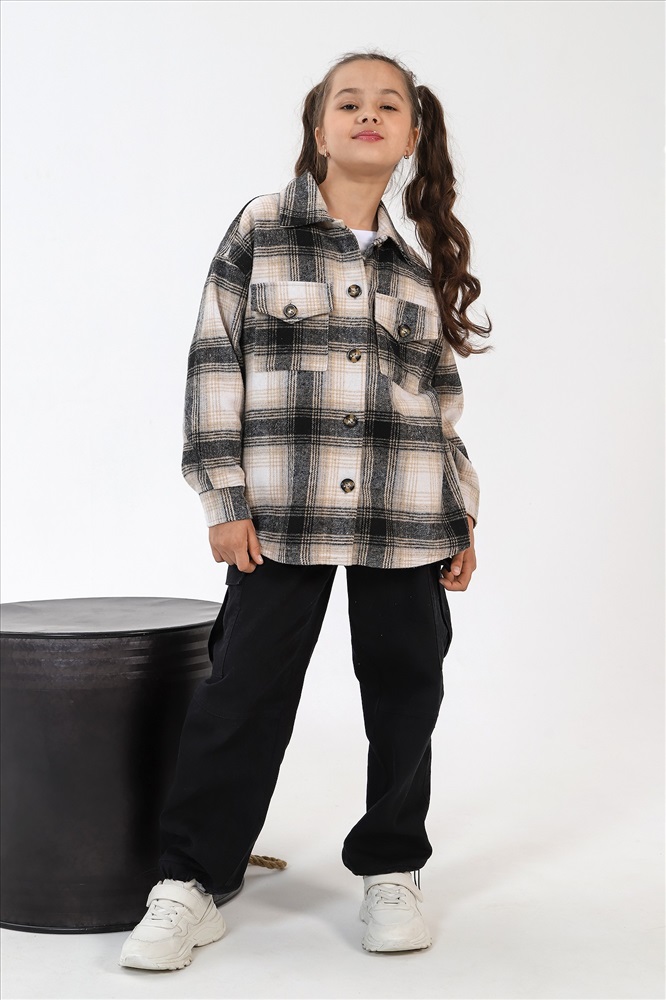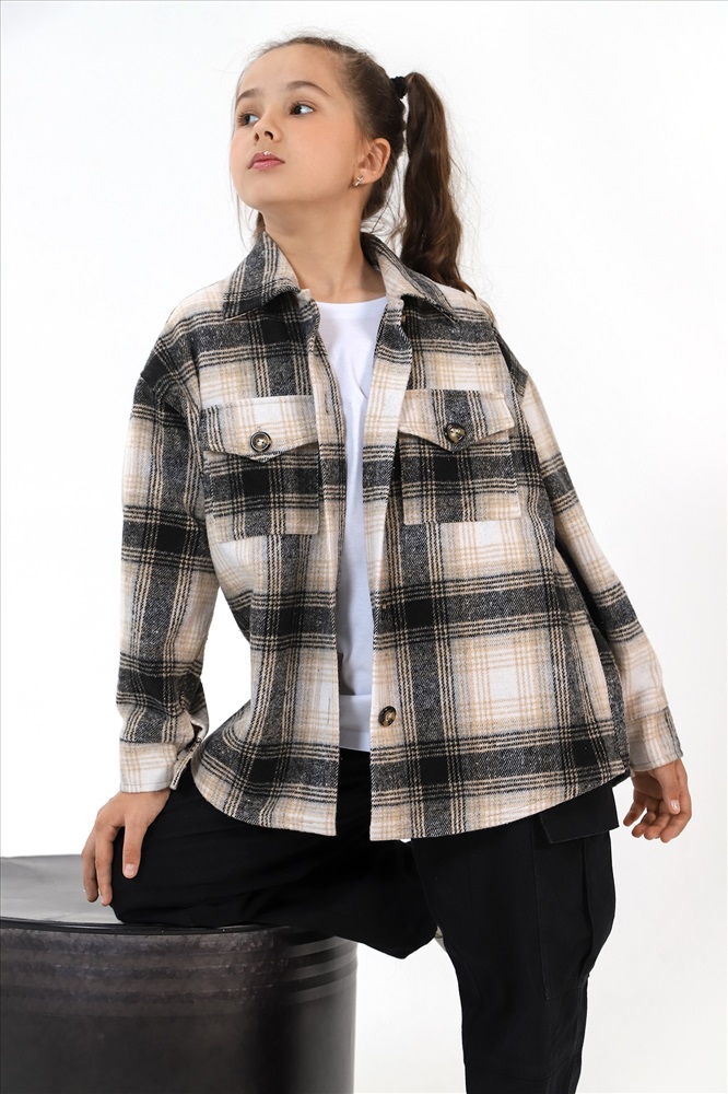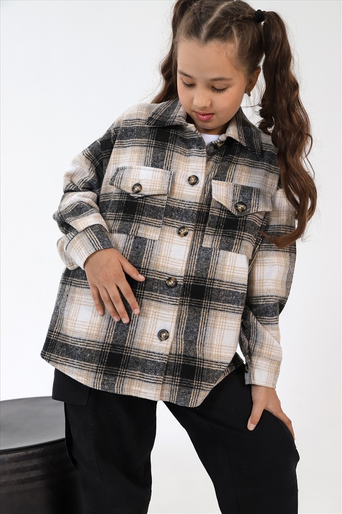 Рубашка для девочки из тканого полотна с рисунком в крупную клетку, длинными втачными рукавами с разрезами на притачных манжетах, застегивающимися на обметанные петли и пуговицы, фигурной линией низа и стояче-отложным воротником. Полочки - с двумя нагрудными карманами и клапанами фигурной формы. Спинка - с притачной кокеткой, выкроенной по косой. В швах соединения манжет с рукавами обработаны по одной складочке. При эксплуатации изделия следует обратить внимание на то, что после ВТО и стирки материал дает усадку по ширине и длине.