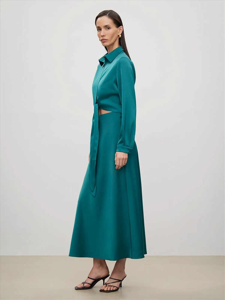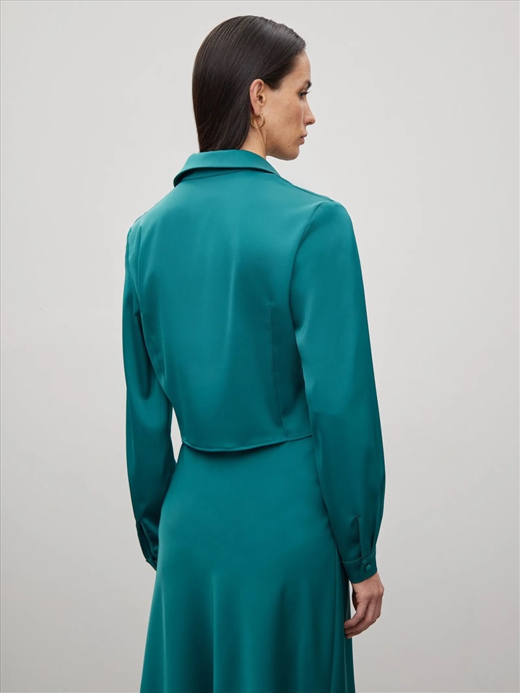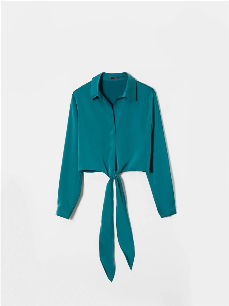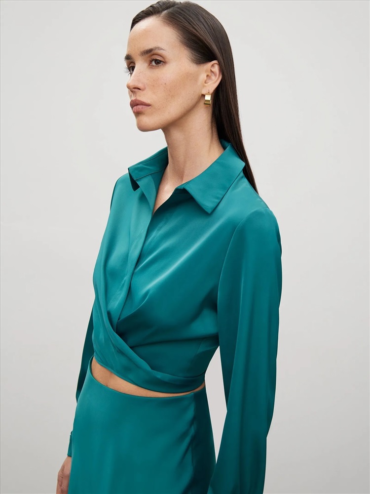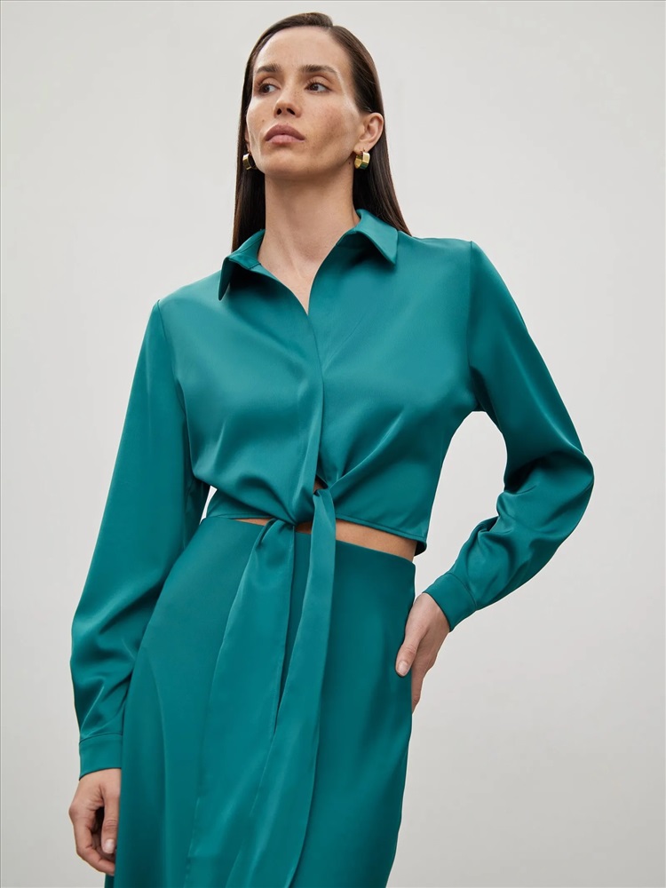 Оригинальная бирюзовая блузка подчеркнёт женственность в образе. Отлично подойдёт для выхода в ресторан, свидания или встречи с подругами. Укороченную модель с длинным рукавом отличает полочка по низу, переходящая в завязки. Их можно стилизовать разными способами под настроение. Рубашка застёгивается на ряд пуговиц под планкой. Выполнена из струящегося материала с содержанием вискозы. Завершить образ можно бельевой юбкой из комплекта или кожаными брюками высокой посадки.