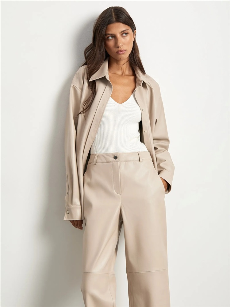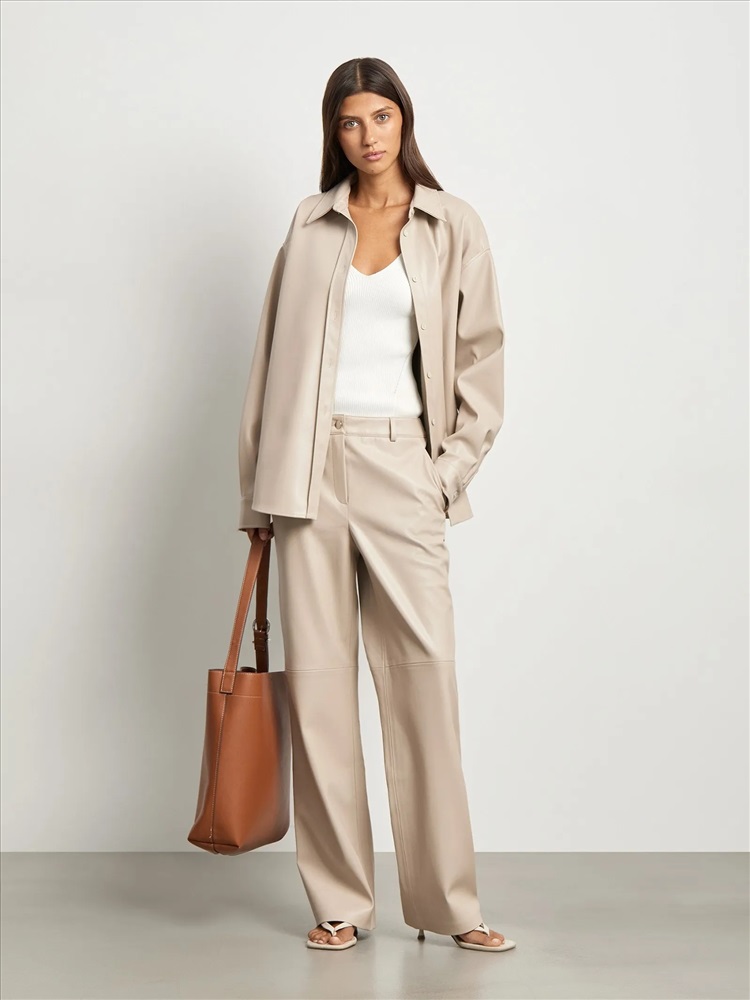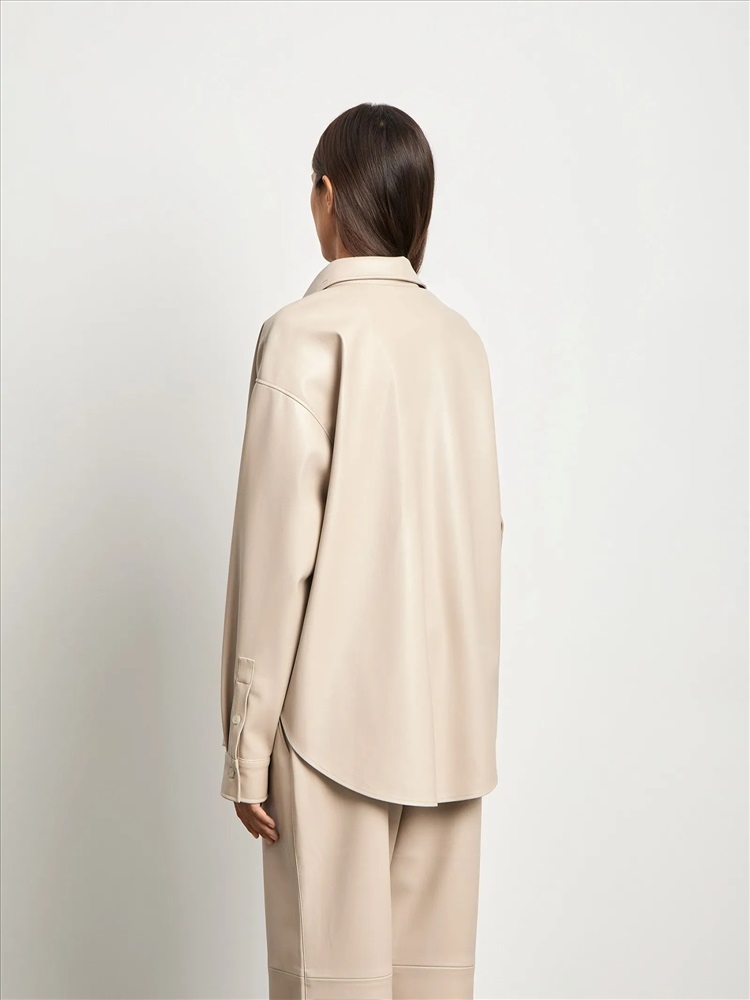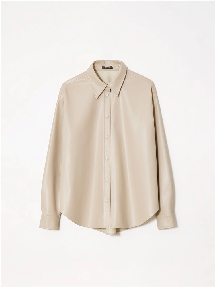Рубашка из экокожи в молочном цвете — модная вещь сезона. Хорошо подходит в качестве второго слоя. Удлинённая модель имеет прямой крой. Выполнена без кокетки на спинке. Завершить образ можно брюками из комплекта. Изделие выполнено без подкладки.