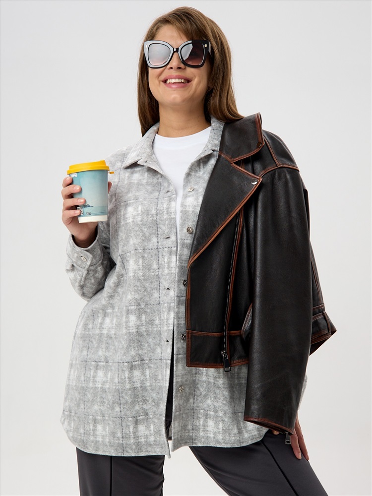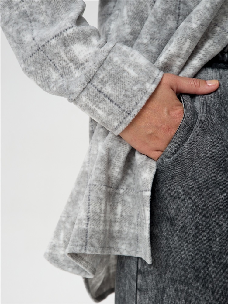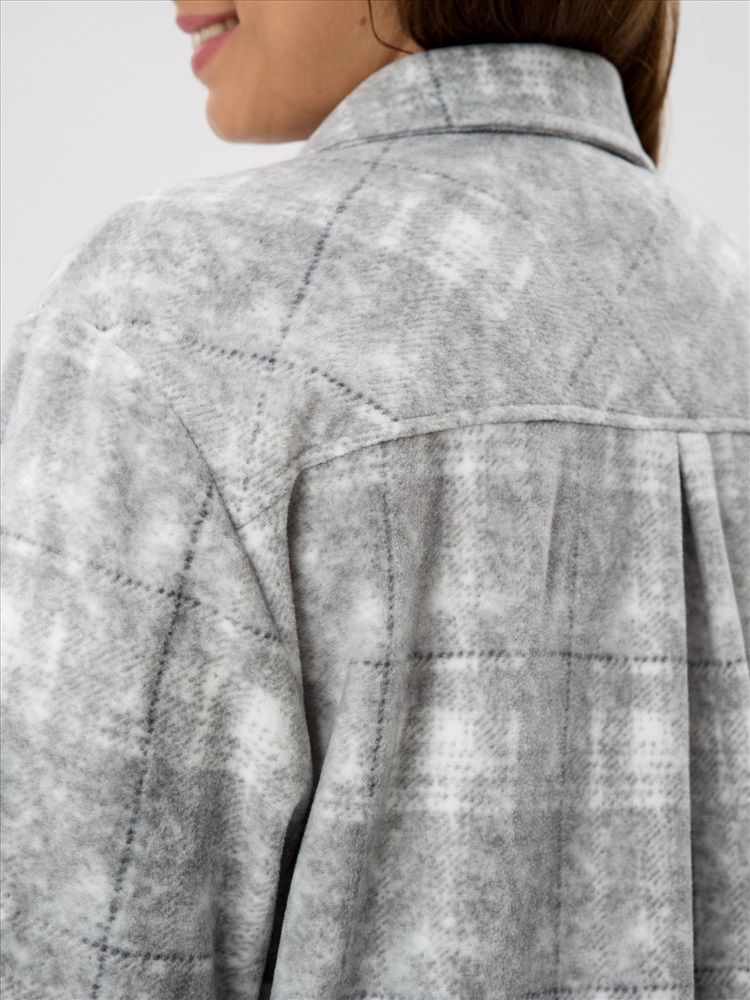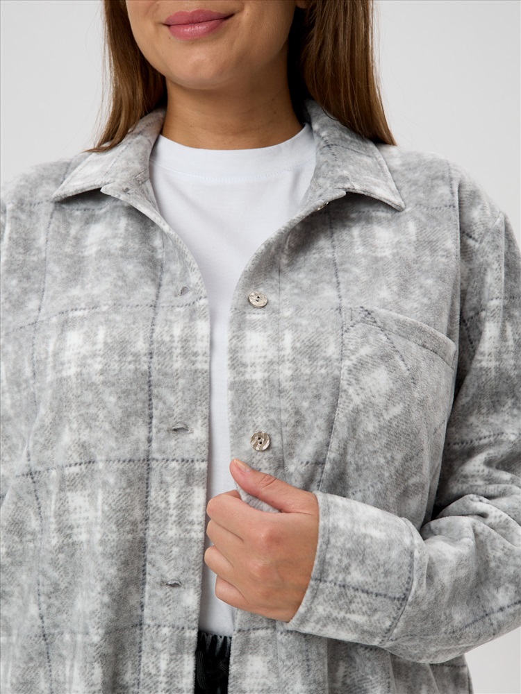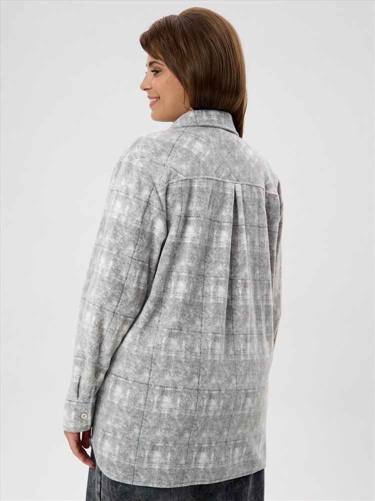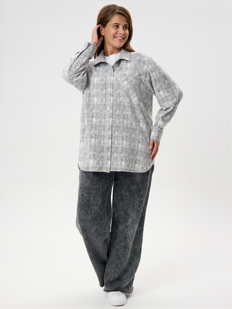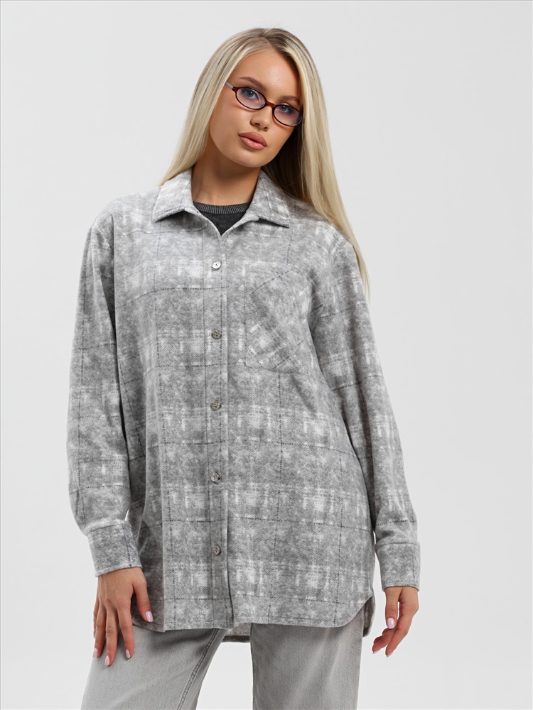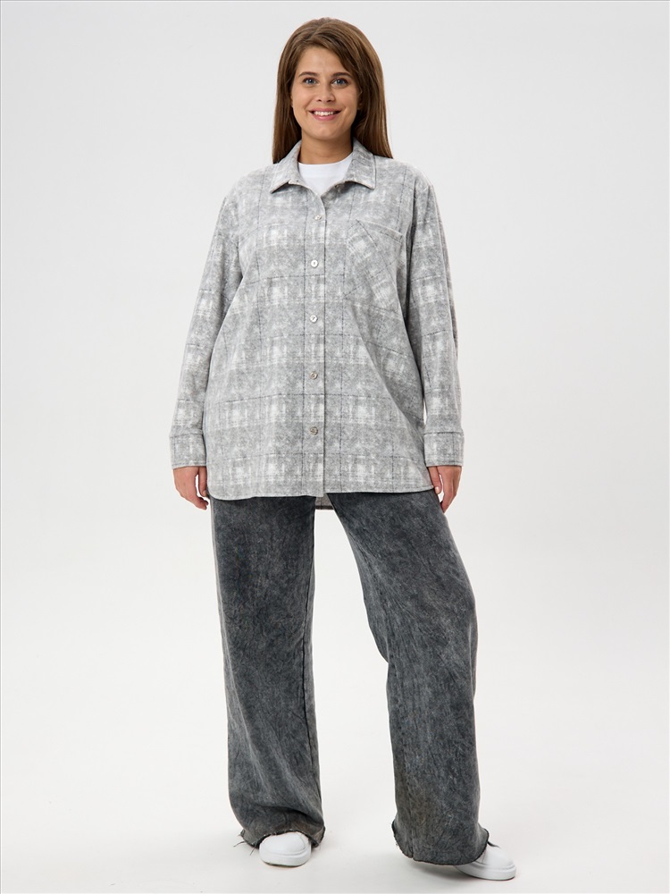 Рубашка (туника) молодежная из трикотажного полотна «флис» с эффектом «варенки», полуприлегающего силуэта, с длинными втачными рукавами на притачных манжетах, стояче-отложным воротником, нагрудным карманом, фигурным низом и центральной бортовой застежкой на петли и пуговицы. Спинка – с отрезной кокеткой и бантовой складкой в центре соединительного шва.