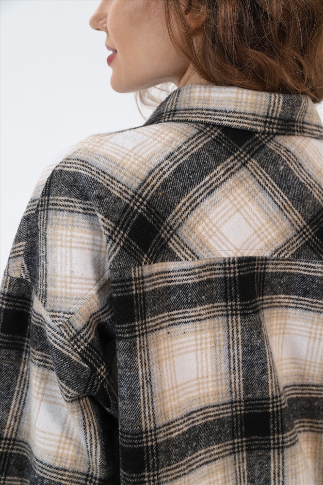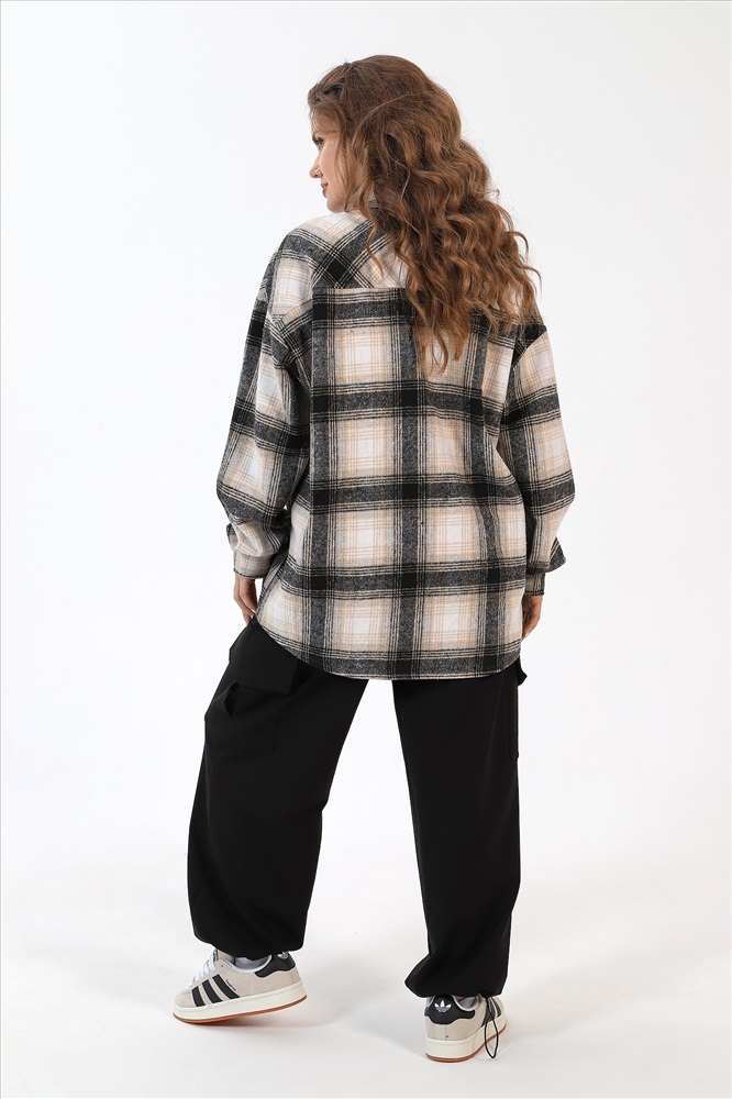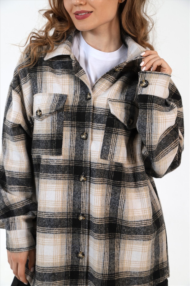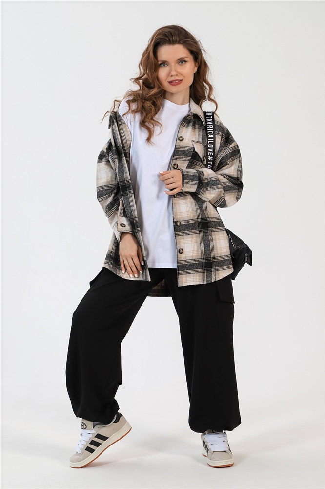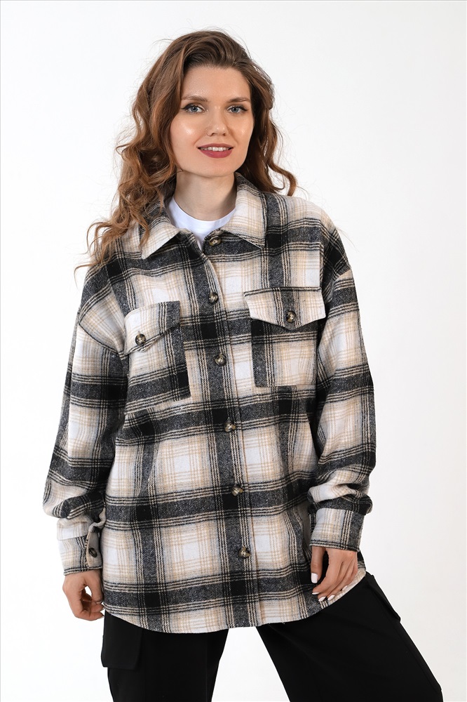 Ткань: Фактурное полотно Рубашка женская из тканого полотна с рисунком в крупную клетку, длинными втачными рукавами с разрезами на притачных манжетах, застегивающимися на обметанные петли и пуговицы, фигурной линией низа и стояче-отложным воротником. Полочки - с двумя нагрудными карманами и клапанами фигурной формы. Спинка - с притачной кокеткой, выкроенной по косой. В швах соединения манжет с рукавами обработаны по одной складочке. При эксплуатации изделия следует обратить внимание на то, что после ВТО и стирки материал дает усадку по ширине и длине.