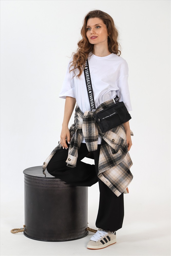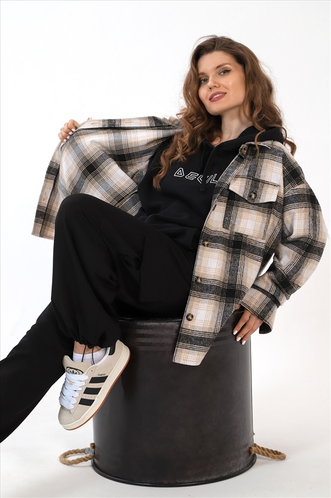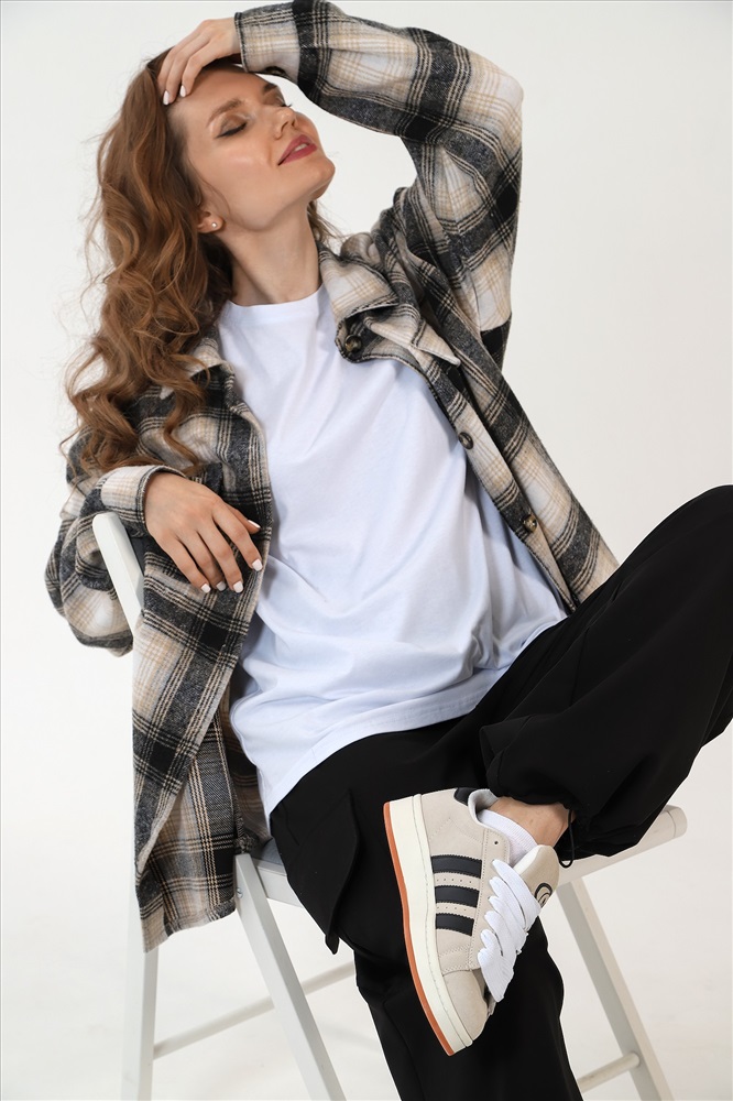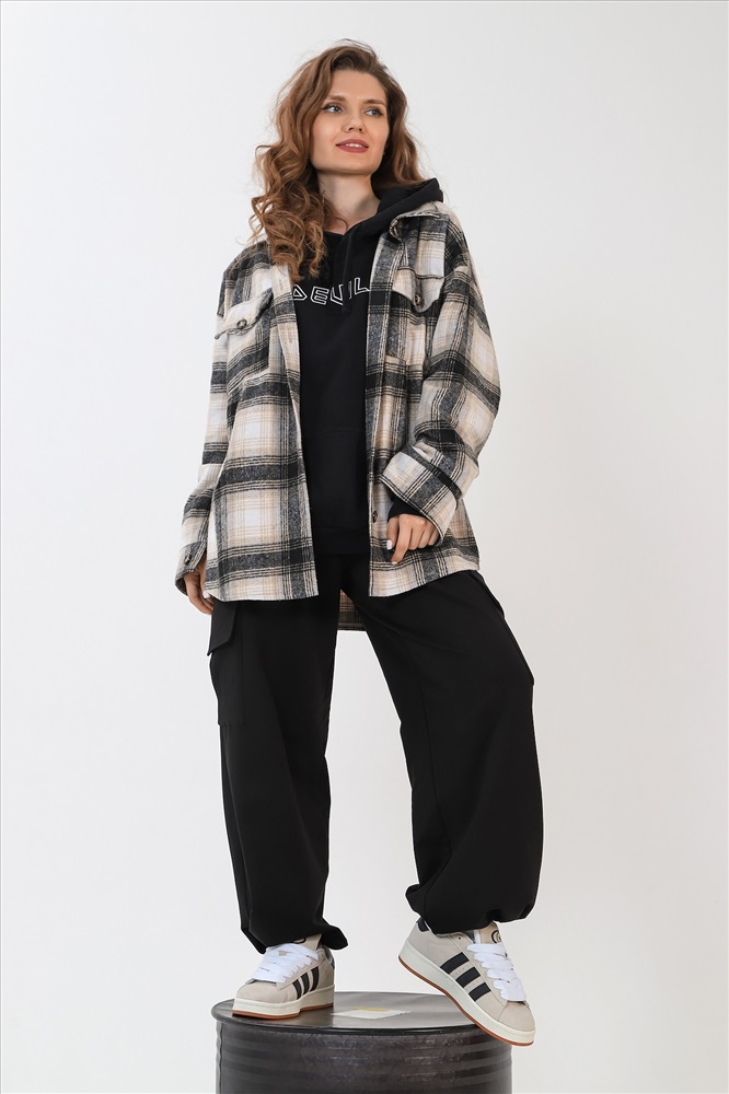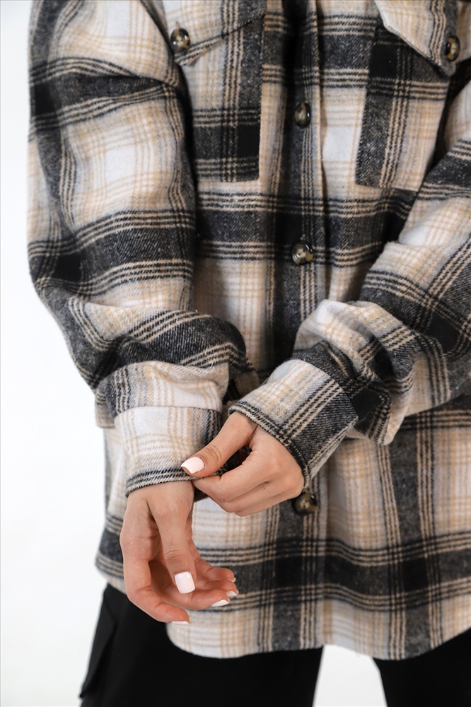 Ткань: Фактурное полотно Рубашка женская из тканого полотна с рисунком в крупную клетку, длинными втачными рукавами с разрезами на притачных манжетах, застегивающимися на обметанные петли и пуговицы, фигурной линией низа и стояче-отложным воротником. Полочки - с двумя нагрудными карманами и клапанами фигурной формы. Спинка - с притачной кокеткой, выкроенной по косой. В швах соединения манжет с рукавами обработаны по одной складочке. При эксплуатации изделия следует обратить внимание на то, что после ВТО и стирки материал дает усадку по ширине и длине.