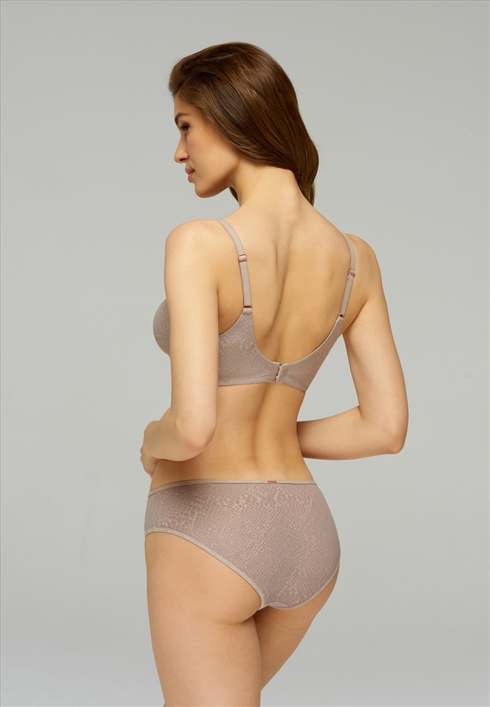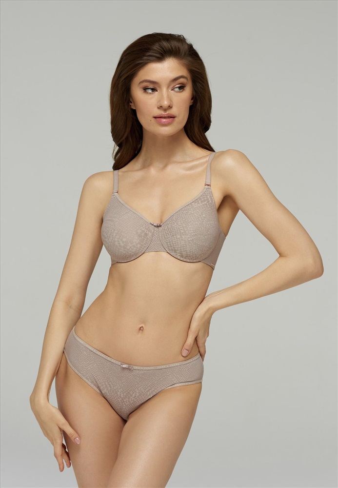 Бюстгальтер с формованной мягкой чашкой на каркасной поддержке. Мягкий жаккардовый стан на подкладке. Обработка боковых деталей в подворот без шва. Спереди съемные бретели. Отделка тесьмой с логотипом Marc & Andre.