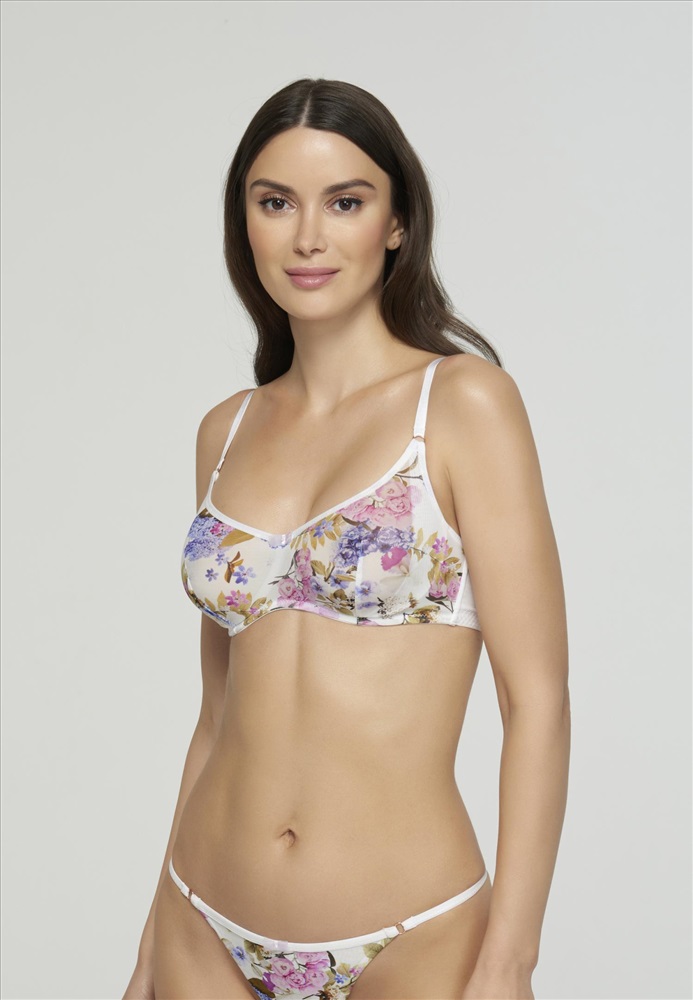 Бюстгальтер из принтованной сетки с мягкой чашкой на каркасной поддержке. Внутри чашки дополнительный боковой подкрой из сетки. Стан из двойной сетки, тесьма по нижнему краю. Боковые детали с поддерживающими косточками. Эффект «скрытого каркаса».