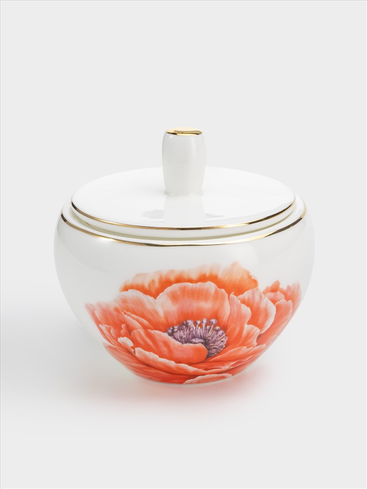 Сахарница, 9 см, 250 мл, фарфор F, белая, с золотистым кантом, Мак, Flowers. Материал: фарфор Fine Bone China. Мыть тёплой водой с применением жидких моющих средств. Не использовать в СВЧ и в посудомоечной машине.