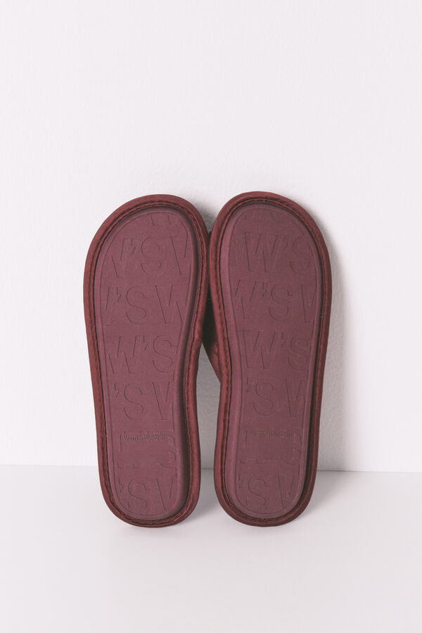Zapatillas abiertas tipo sandalia con lazo decorativo en la pala. Acabado en satén color burdeos.