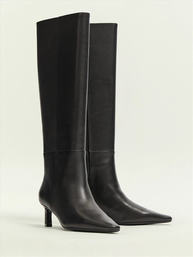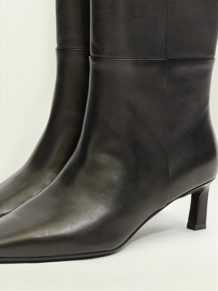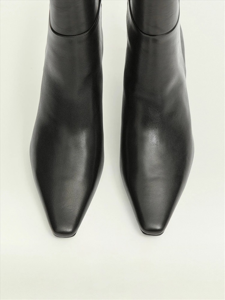 Чёрные сапоги-трубы из натуральной кожи. Высота каблука — 5,5 см. Разработанная с заботой о вашем удобстве колодка и устойчивый каблук позволяют носить эту обувь весь день и чувствовать себя в ней комфортно. Актуальная базовая модель на каждый день подойдёт к большинству повседневных образов.