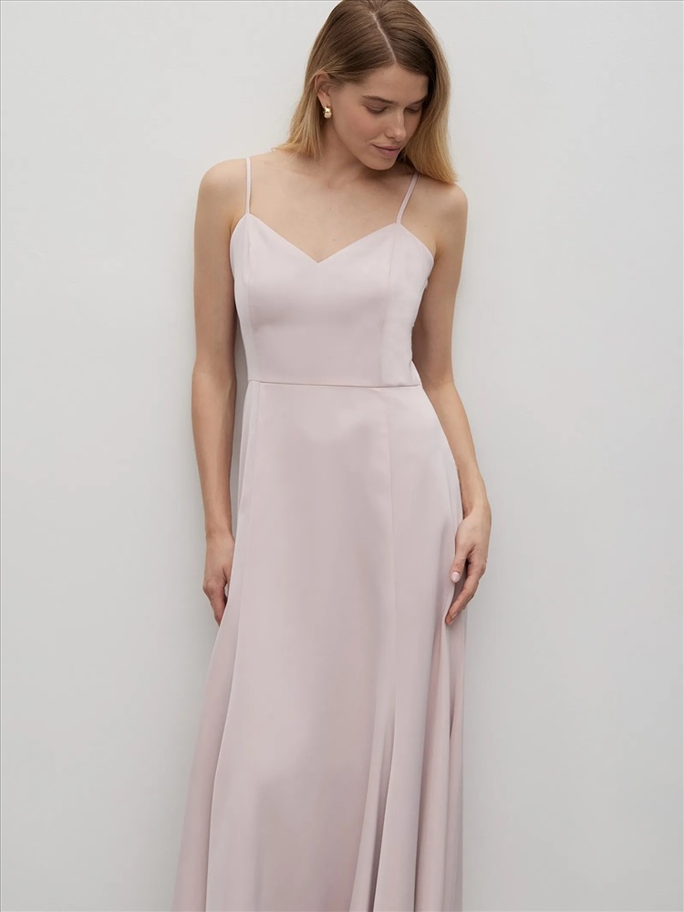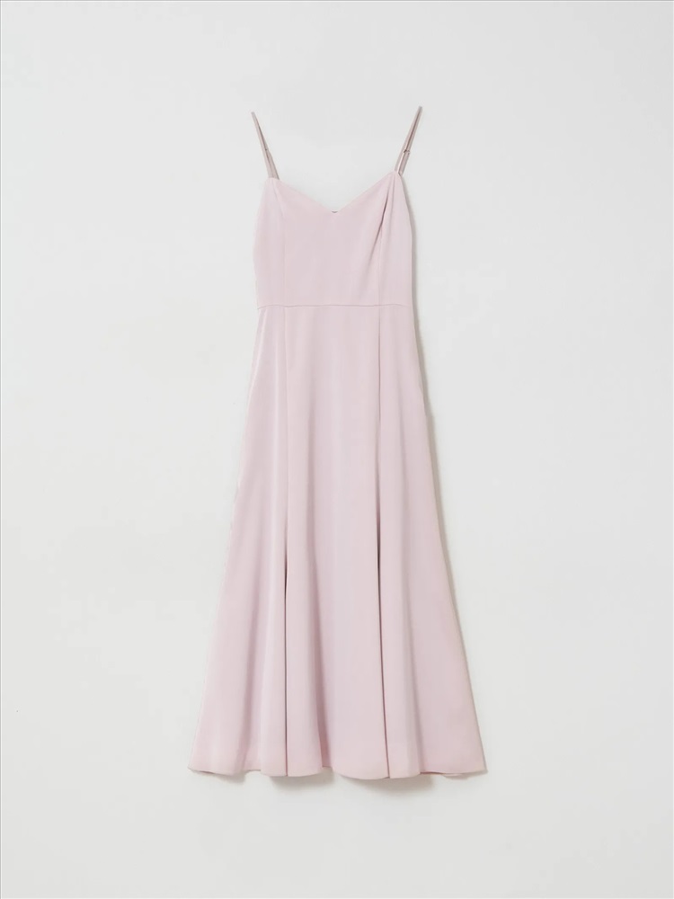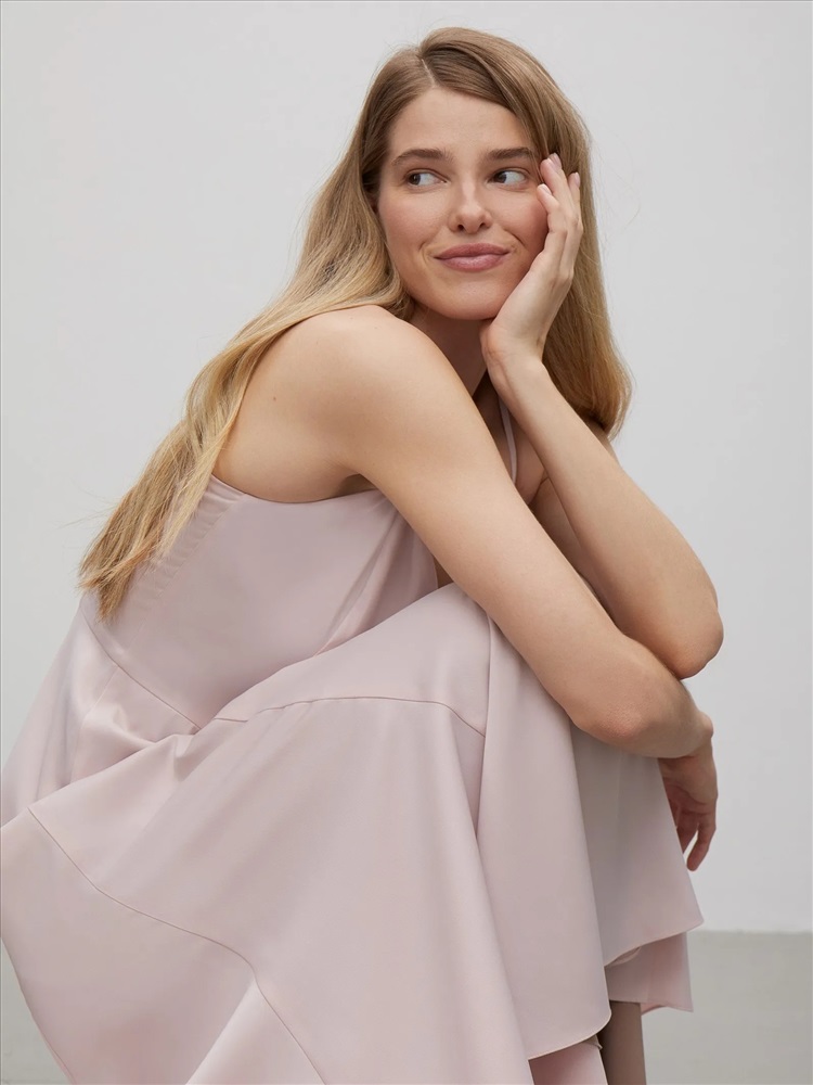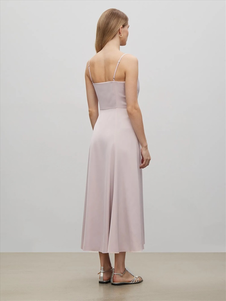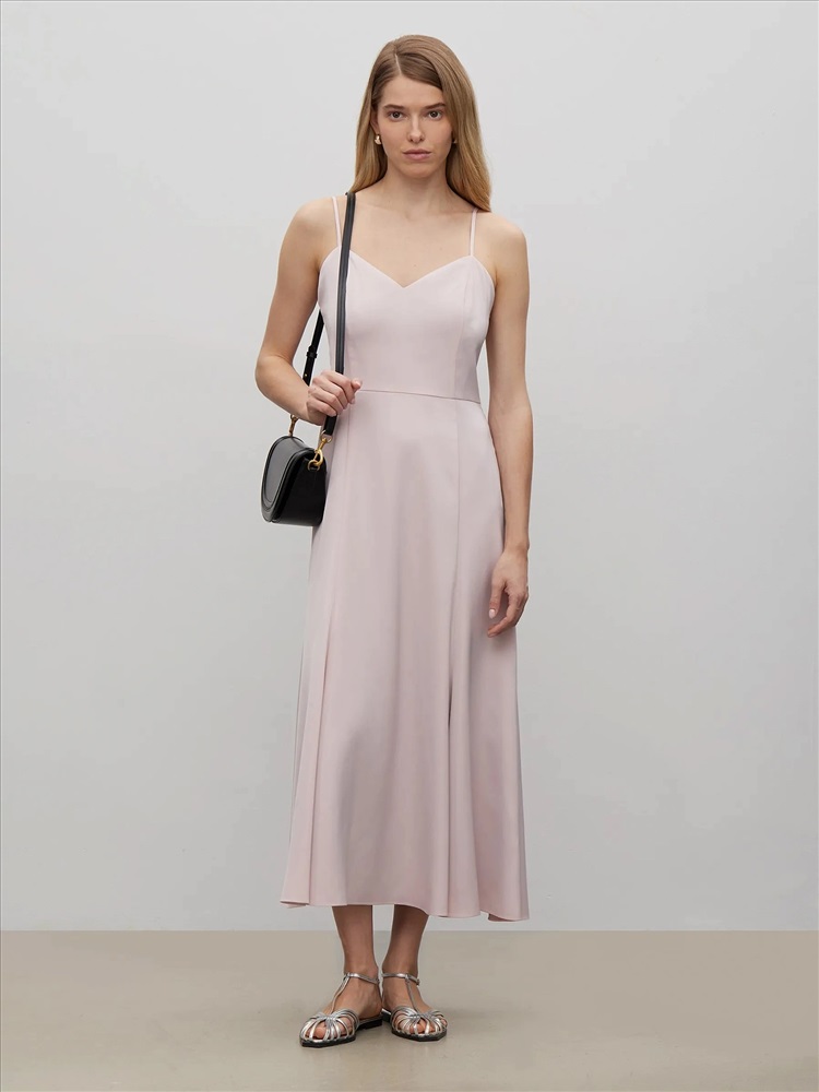 Изящное платье для летних образов. Хорошо садится по фигуре. Мягкий пудровый цвет радует глаз. Юбка спадает красивыми складками. Приталенная модель на тонких бретелях с треугольным декольте подчеркнёт изящество верхней части тела. Длина миди делает платье отличным выбором для любого случая. Изделие застёгивается на молнию сбоку. Выполнено из материала с содержанием вискозы, на подкладке.
