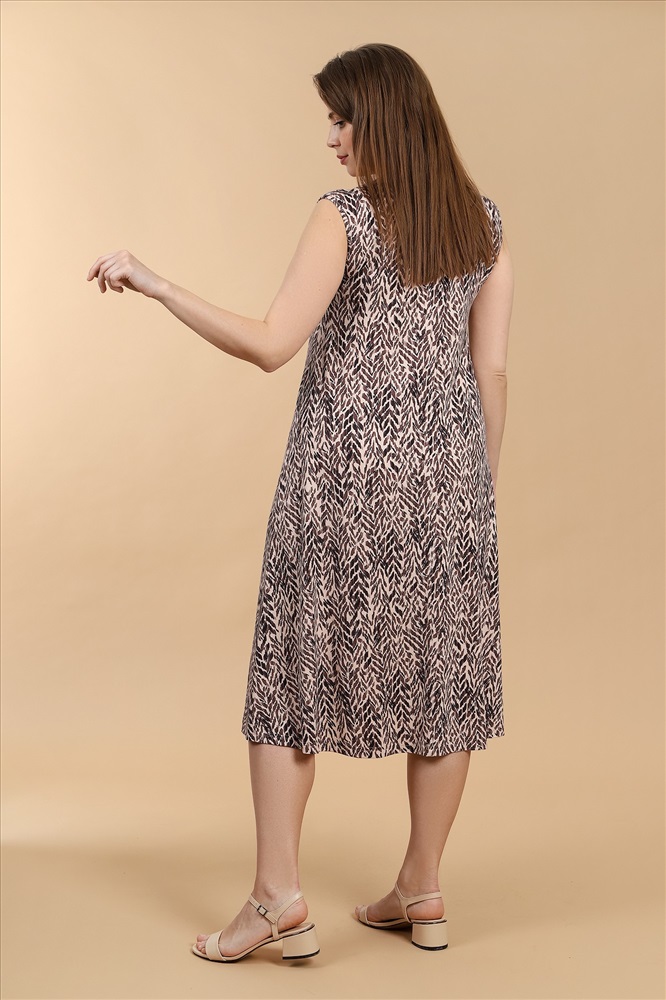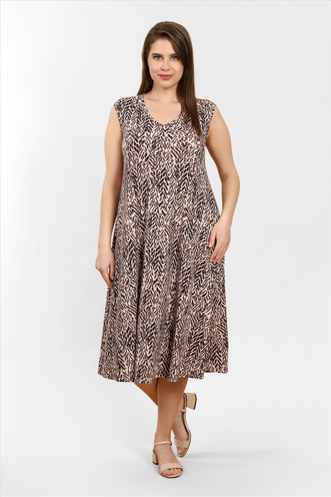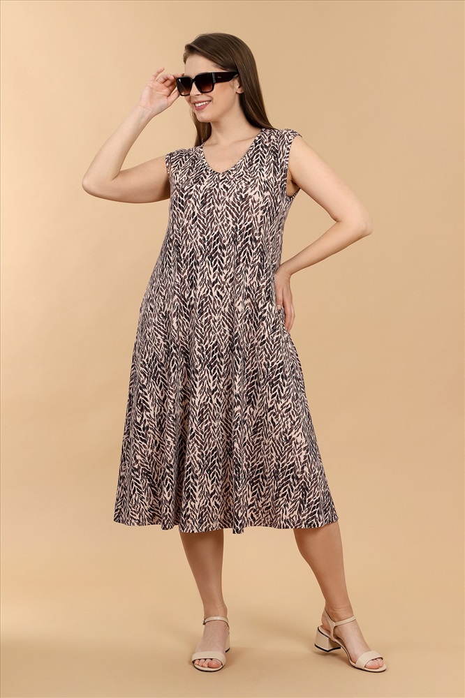 Сарафан женский из трикотажного вискозного полотна с набивным рисунком свободного покроя, расширенное книзу, с горловиной V- образной формы, окантованной основным материалом.