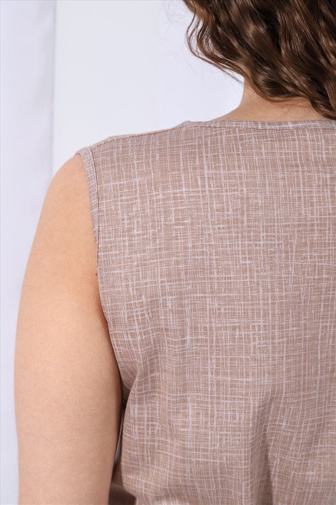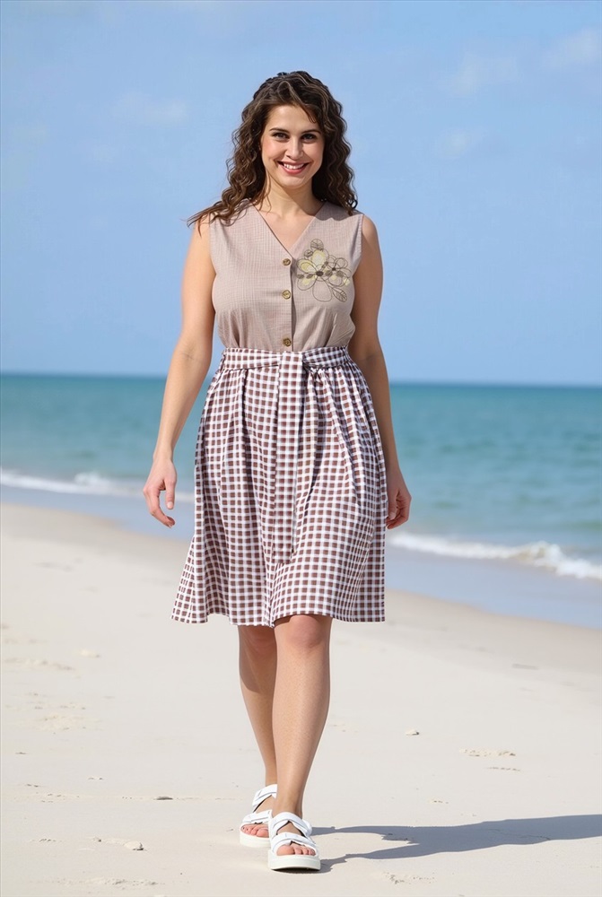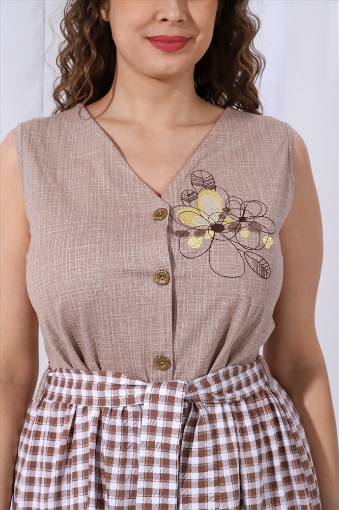 Сарафан из трикотажного полотна «кулирка» в сочетании двух видов в единой цветовой гамме: с мелкоузорчатым набивным рисунком, имитирующим ткацкое переплетение «рогожка» и с рисунком в мелкую клетку, отрезной по линии талии, с V-образной горловиной, центральной бортовой застежкой на обметанные петли и пуговицы и вышивкой на левой полочке лифа. Горловина спинки и проймы окантованы основным материалом. Юбка присборена по шву соединения с лифом. Съемный завязывающийся пояс фиксируется двумя шлевками из окантовки, вставленными в боковые швы на уровне талии.