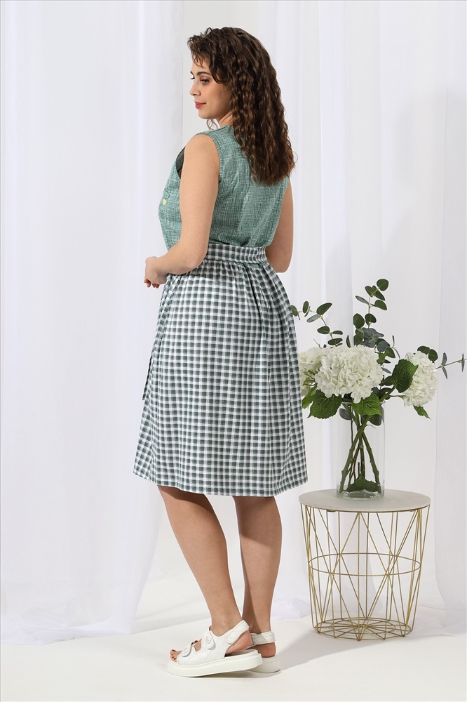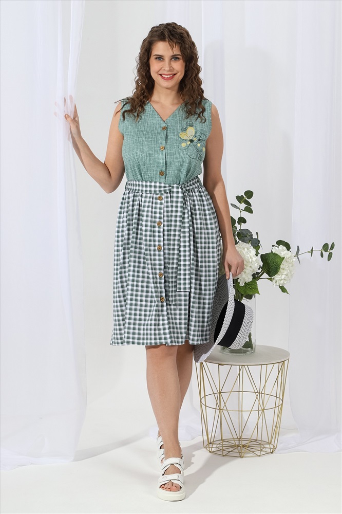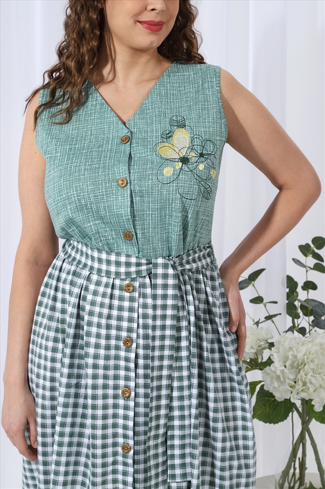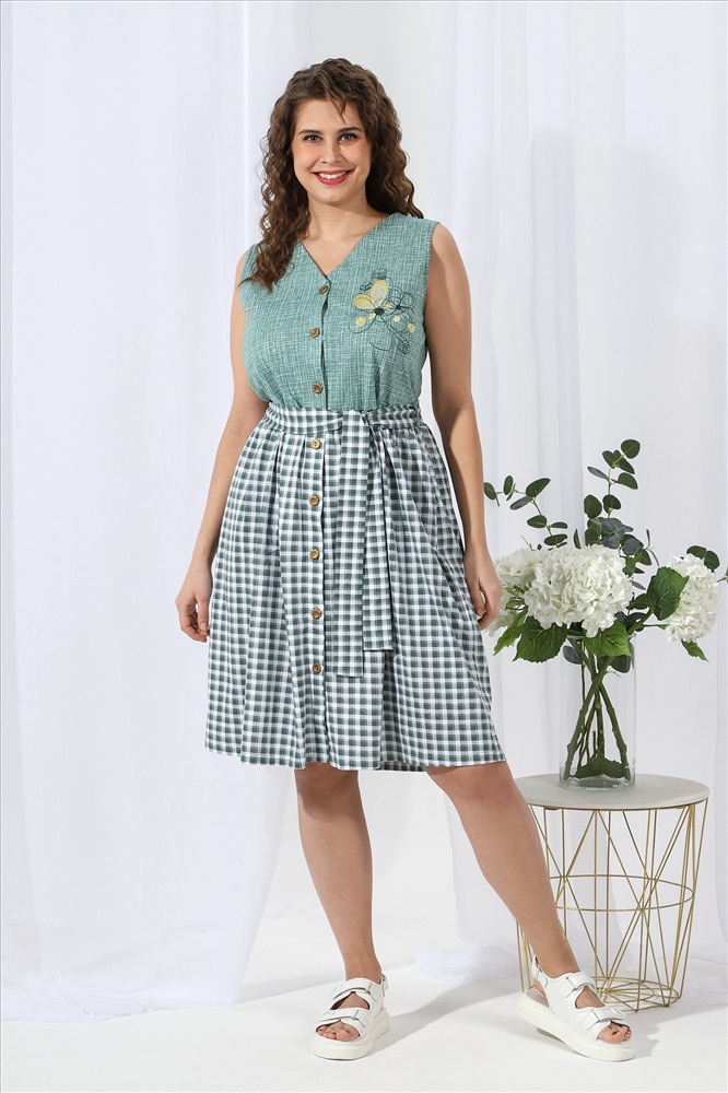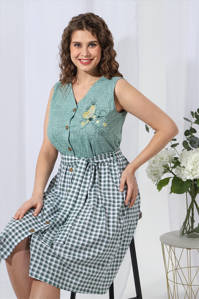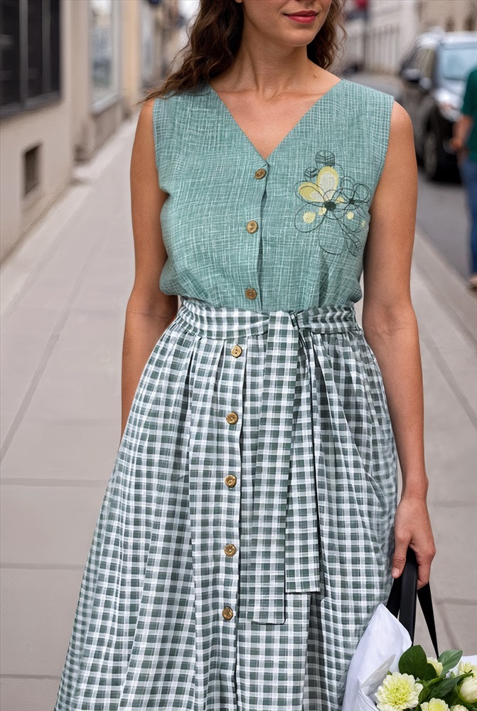 Сарафан из трикотажного полотна «кулирка» в сочетании двух видов в единой цветовой гамме: с мелкоузорчатым набивным рисунком, имитирующим ткацкое переплетение «рогожка» и с рисунком в мелкую клетку, отрезной по линии талии, с V-образной горловиной, центральной бортовой застежкой на обметанные петли и пуговицы и вышивкой на левой полочке лифа. Горловина спинки и проймы окантованы основным материалом. Юбка присборена по шву соединения с лифом. Съемный завязывающийся пояс фиксируется двумя шлевками из окантовки, вставленными в боковые швы на уровне талии.