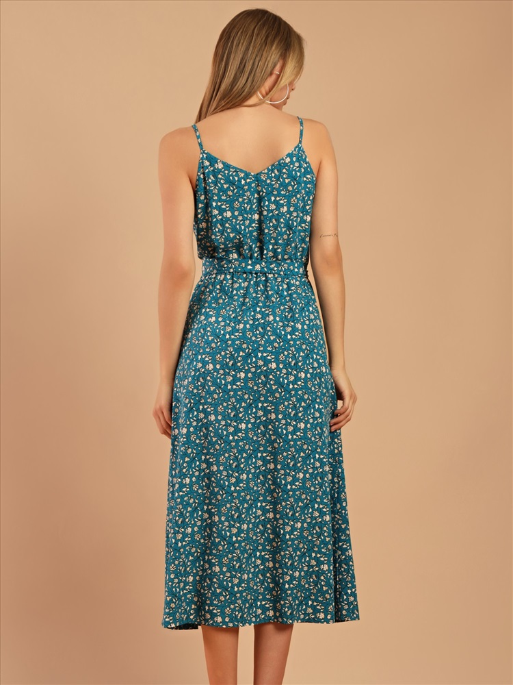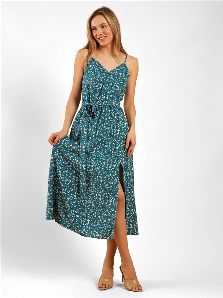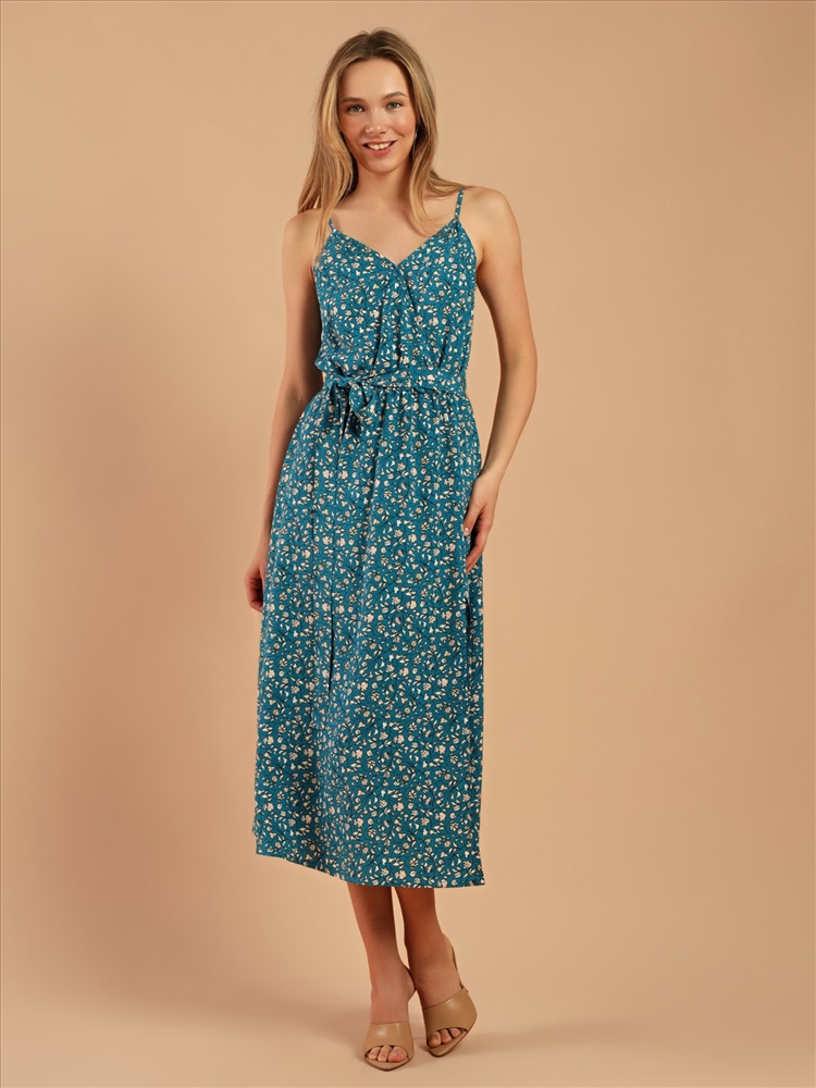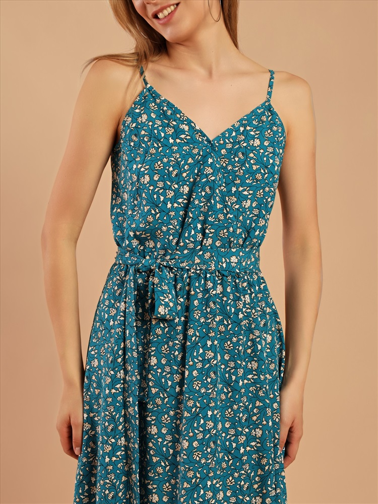 Сарафан молодежный из тканого полотна «штапель» с набивным рисунком, с углубленной V-образной горловиной, на узких бретелях, отрезное по линии талии, с расклешенной юбкой, собранной с помощью эластичной тесьмы. Горловина и проймы окантованы основным материалом. Переднее полотнище юбки из двух частей, в соединительном шве выполнен разрез. Изделие комплектуется съемным поясом, завязывающимся на талии.