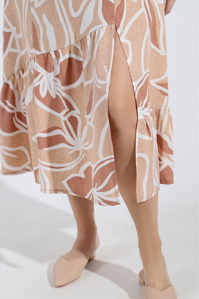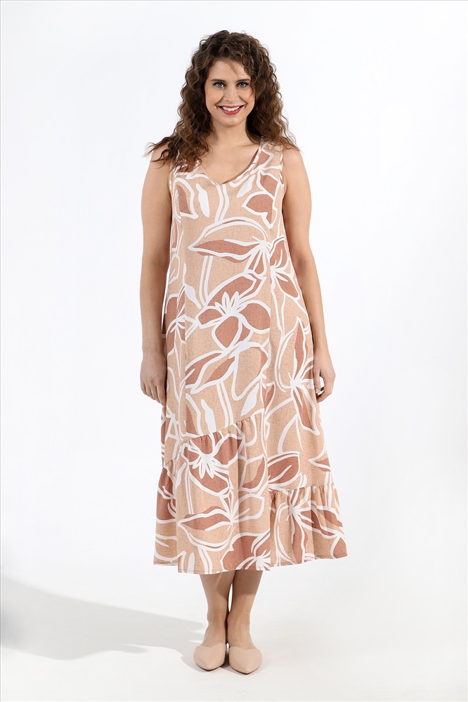 Сарафан женский из тканого штапельного полотна с набивным рисунком, удлиненное свободного силуэта, без рукавов, с рельефными швами, выходящими из пройм. По нижнему косому срезу притачная оборка и разрез в левом рельефном шве. Проймы и V-образная горловина окантованы основным материалом.