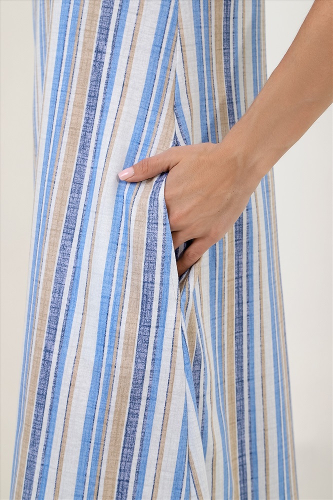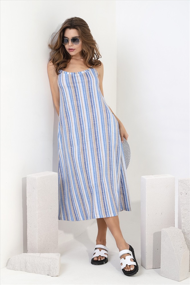 Сарафан молодежный из трикотажного полотна «кулирка» с набивным рисунком в полоску, полуприталенного силуэта на тонких бретелях, с карманами в боковых швах. Вырез горловины полочки и спинки обработаны притачной планкой из основного материала, проймы окантованы.