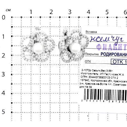 Серьги из серебра с жемчугом и фианитами родированные 925 пробы 2-1072р