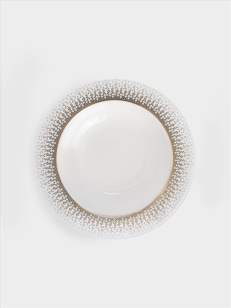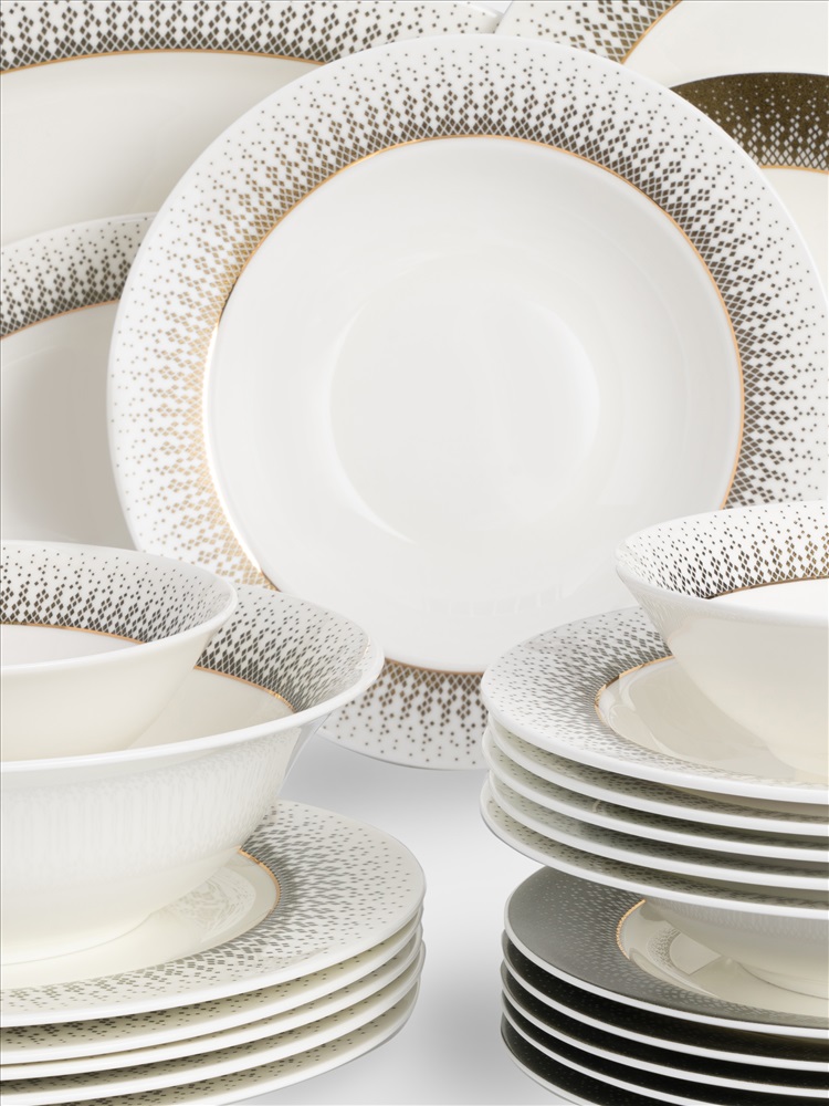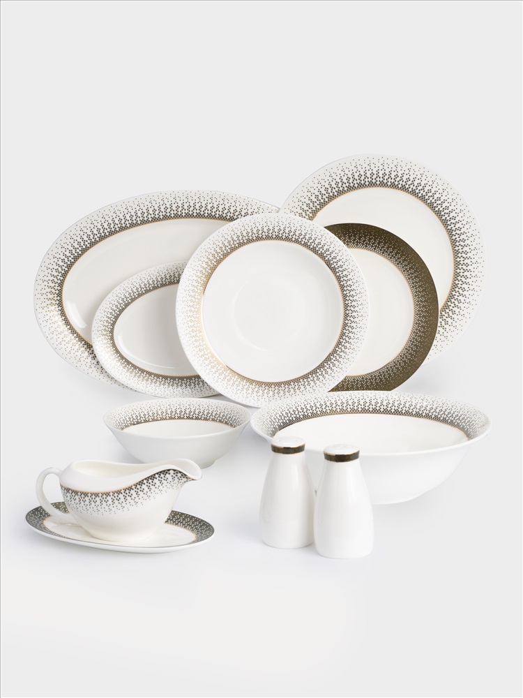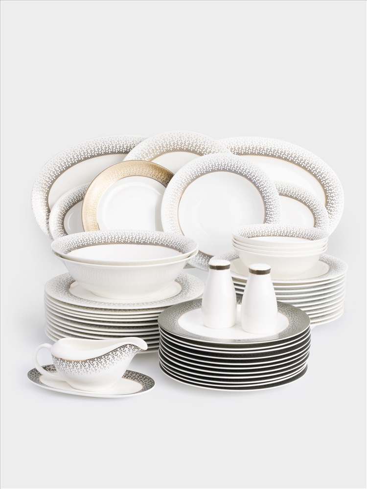 Бренд: ANNA LAFARG EMILY Коллекция: РЕГУЛЯРНАЯ Страна бренда: Китай Сервиз обеденный, 12 перс, 50 пр, фарфор F, бело-зеленый, с золотистым кантом, матовый, Virtus. Материал: фарфор Fine Bone China. Не использовать в посудомоечной машине и СВЧ. Мыть тёплой водой мягкими моющими средствами. При длительном контакте с солью, уксусом, томатным соусом, цитрусовыми - элементы декора на посуде могут быть повреждены.