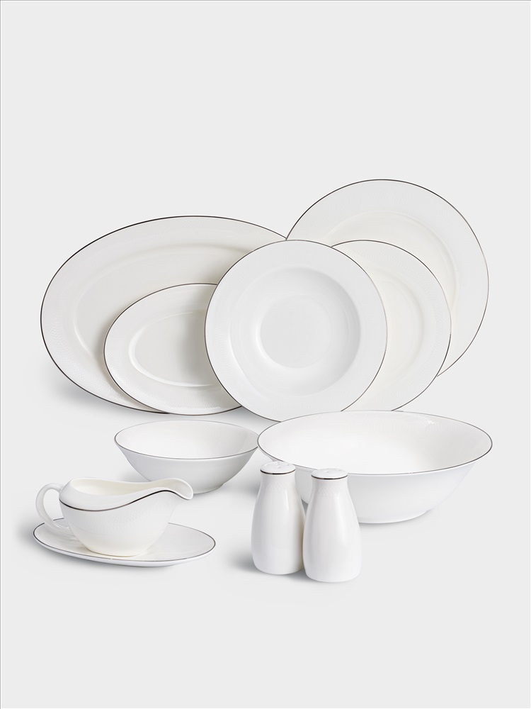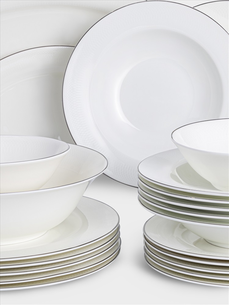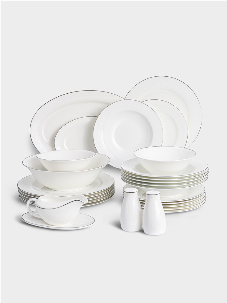 Сервиз обеденный, 6 перс, 27 пр, фарфор F, белый, с серебристым кантом, Ivory. Материал: фарфор Fine Bone China. Не использовать в посудомоечной машине и СВЧ. Мыть тёплой водой мягкими моющими средствами. Просим учесть, что при длительном контакте с солью, уксусом, томатным соусом, цитрусовыми - элементы декора на посуде могут быть повреждены.