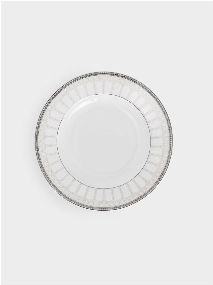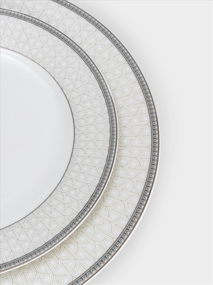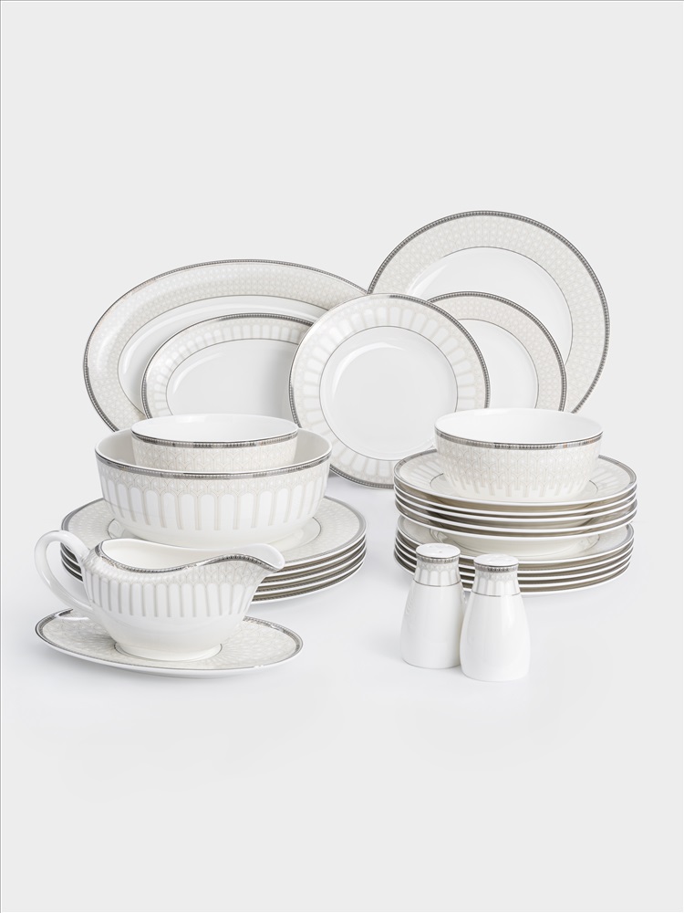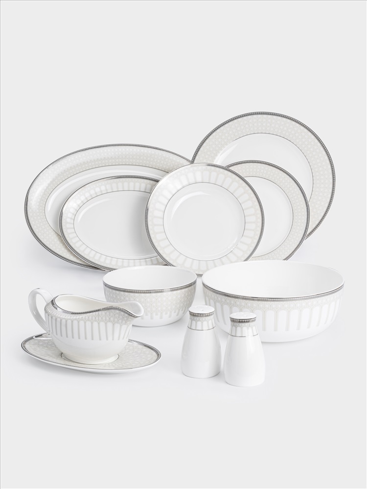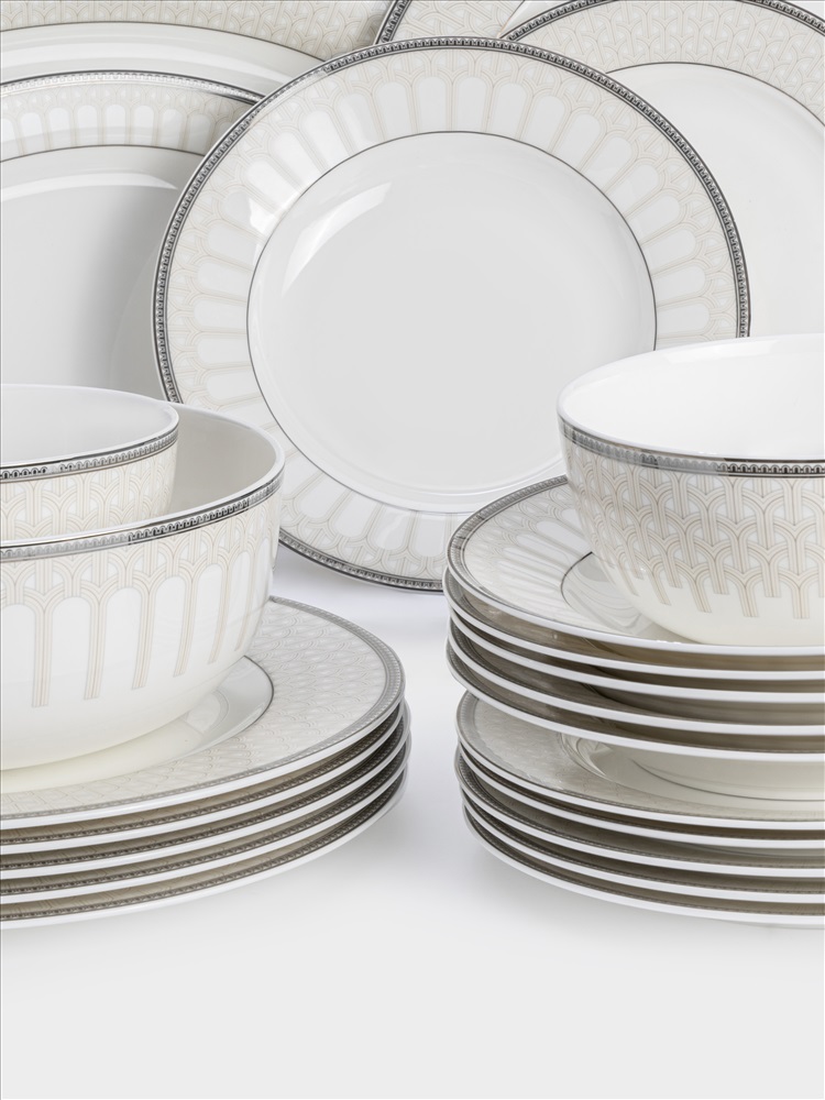 Бренд: ANNA LAFARG EMILY Коллекция: РЕГУЛЯРНАЯ Сервиз обеденный, 6 перс, 27 пр, фарфор F, белый, с серебристым кантом, Riviera. Материал: фарфор Fine Bone China. Не использовать в посудомоечной машине и СВЧ. Мыть тёплой водой мягкими моющими средствами. Просим учесть, что при длительном контакте с солью, уксусом, томатным соусом, цитрусовыми - элементы декора на посуде могут быть повреждены.