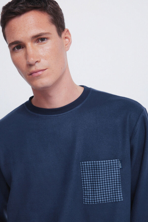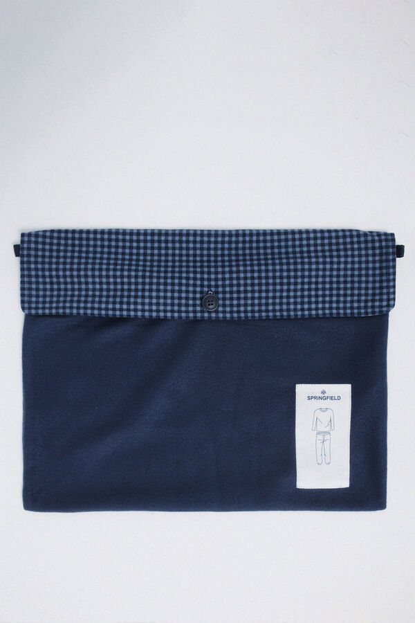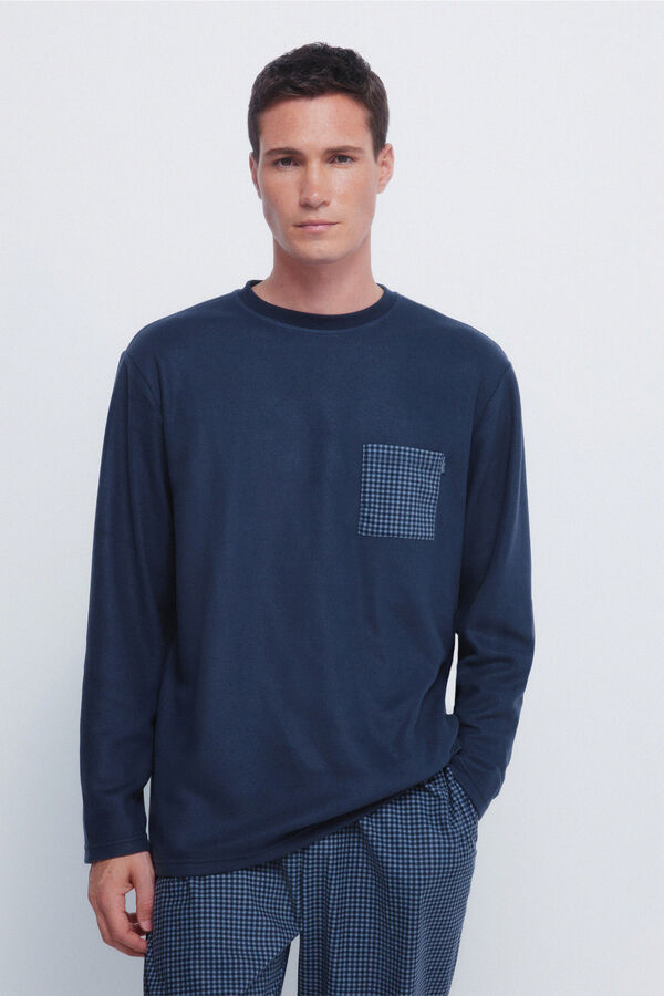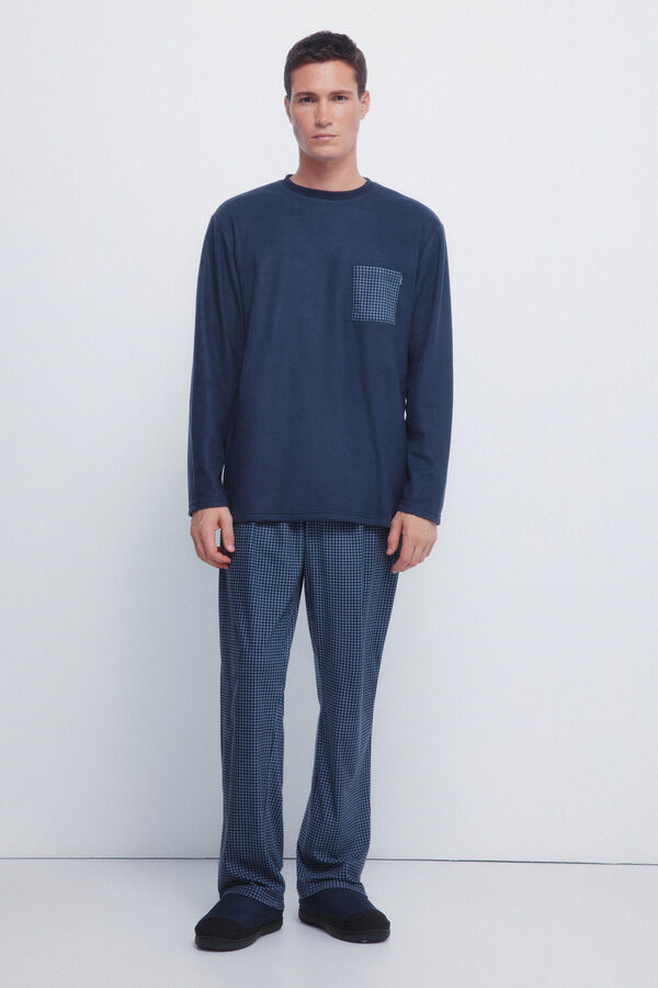 Pijama largo tejido cálido en tonos azules. Camiseta azul con bolsillo en el pecho. Pantalones de cuadros vichy en colores azules con bolsillos.Cinturilla con cordón ajustable.