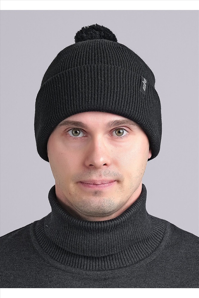 Шапка мужская двойная с отворотом. Декорирована стильной нашивкой логотип и ниточным помпоном.