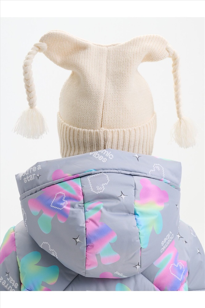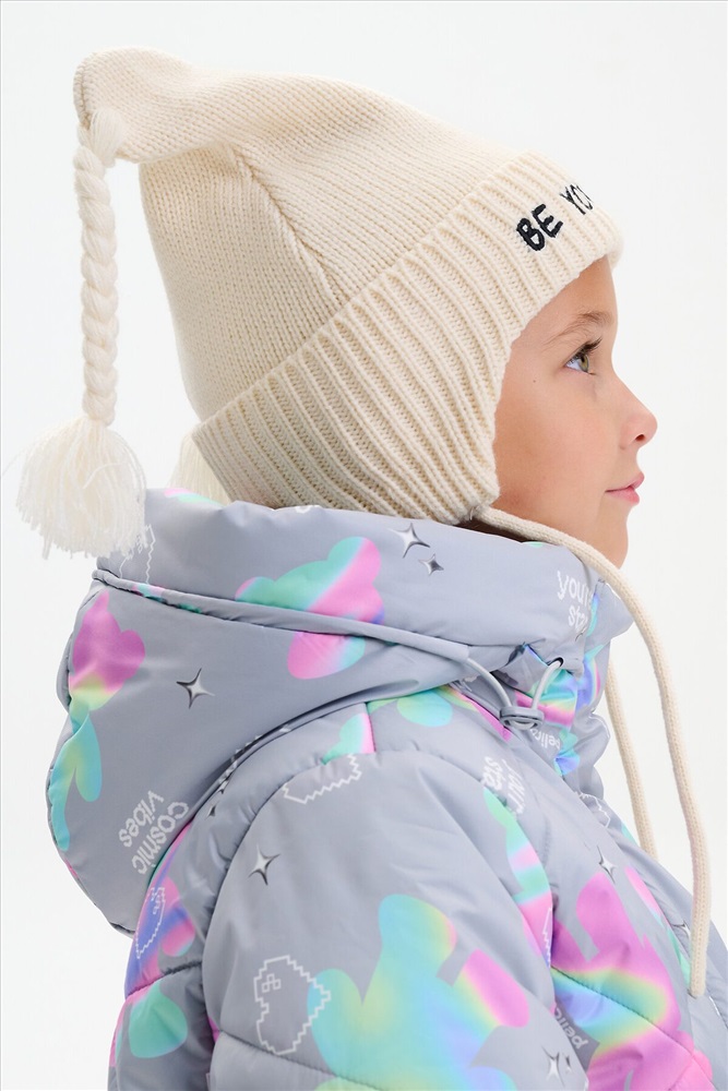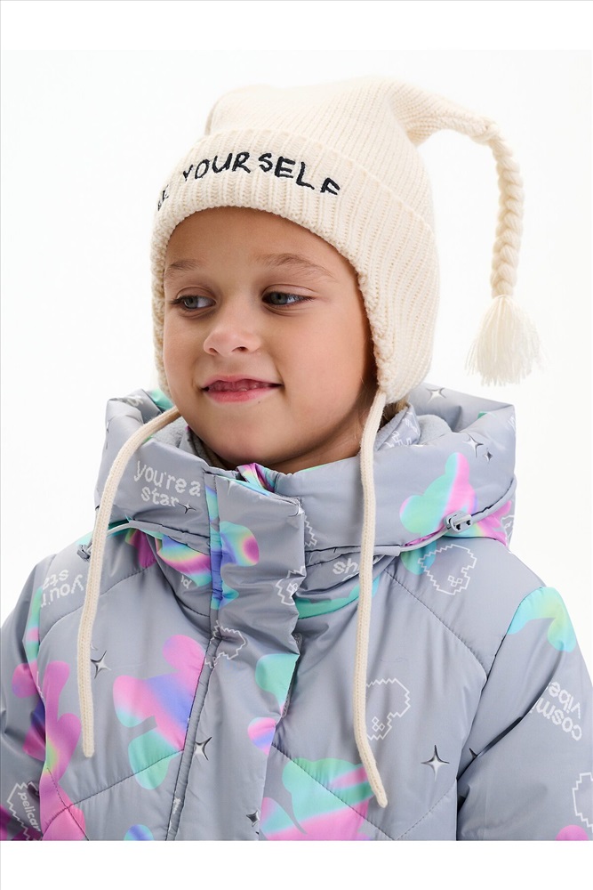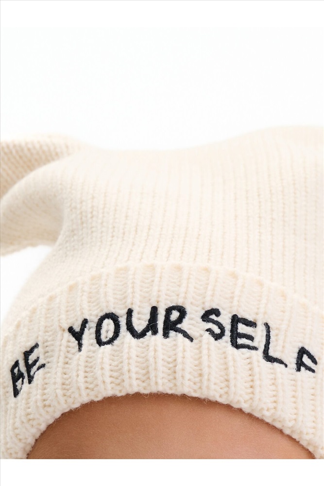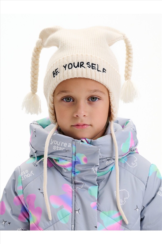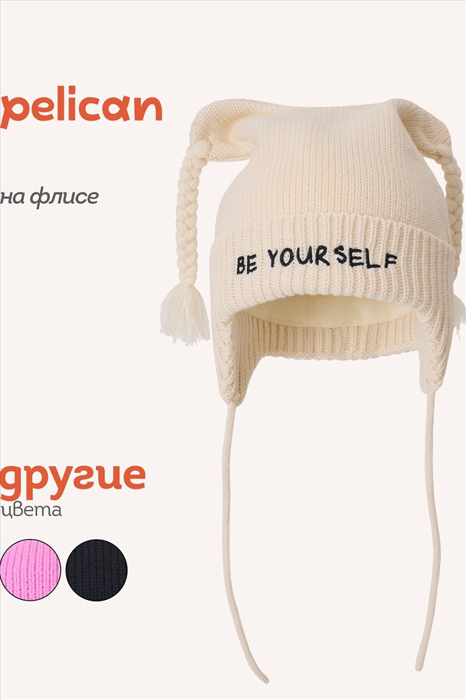 Тёплая и мягкая шапка с завязками на уютном флисовом подкладе — отличный выбор для прохладной погоды. Верхняя часть украшена забавными свисающими ушками с милыми косичками, которые придают модели игривый и неповторимый стиль. Шапка связана плотной, эластичной вязкой с аккуратным отворотом и цельновязанными ушками по низу. Модель отлично закрывает уши и шею, надёжно защищая от ветра и холода. Мягкие завязки обеспечивают комфортную и надежную фиксацию на голове. Особенный акцент — вышивка на отвороте с вдохновляющей надписью «Будь самим собой», которая придаёт образу индивидуальность и настроение.