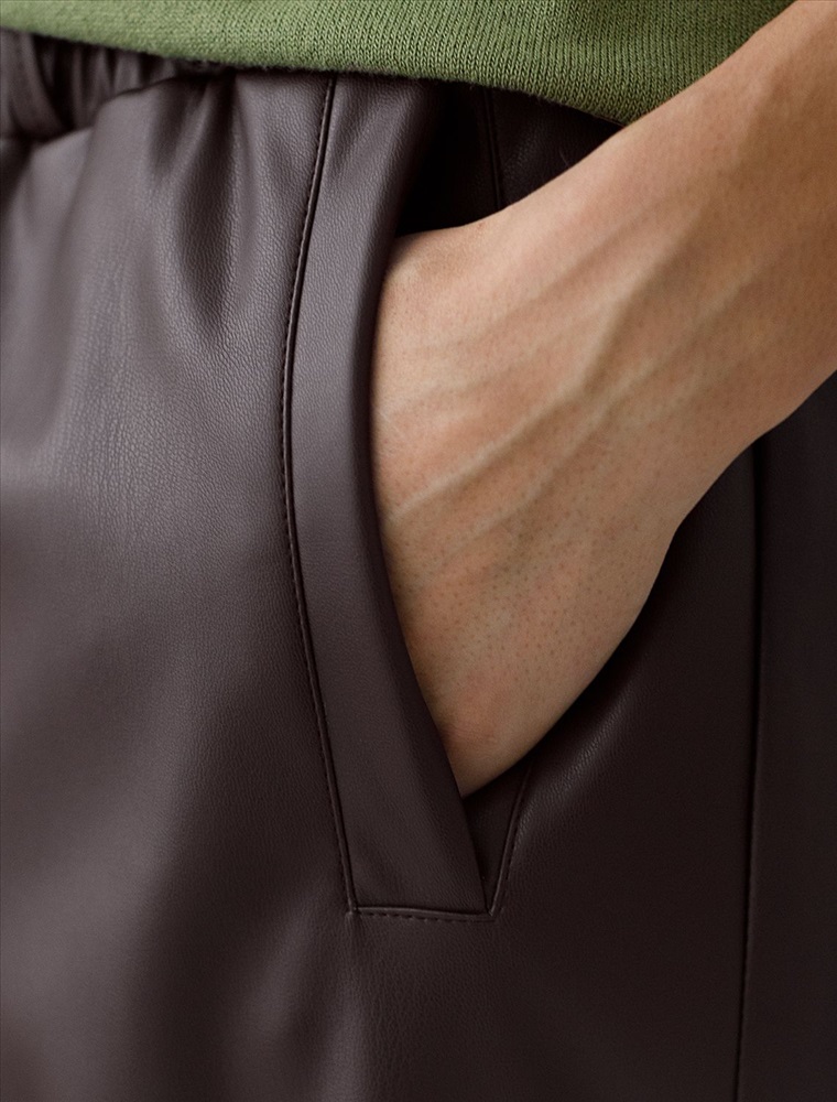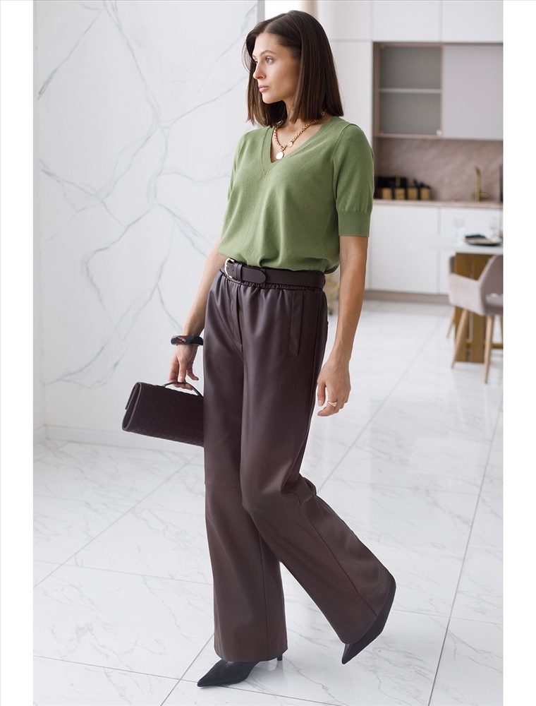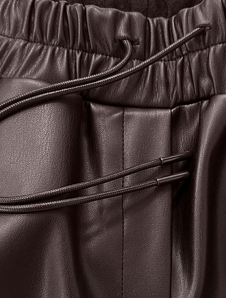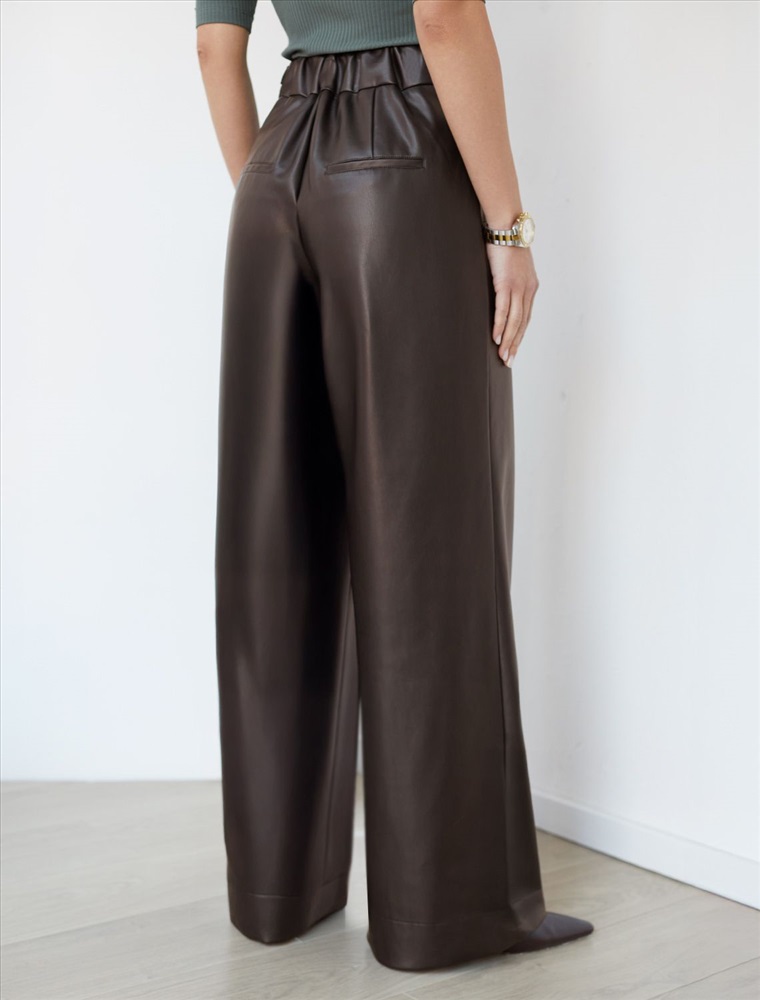 Трендовая модель для смелых fashion-образов. Эти брюки из качественной искусственной кожи создают бунтарский урбанистический лук. Модель с высокой посадкой на поясе и равномерно широким клешёным силуэтом от бедра до низа визуально вытягивает фигуру. Мягкая подкладка пояса обеспечивает комфорт, не сдавливая талию. Универсальный коричневый цвет легко комбинируется с объемными худи, кроп-топами или лаконичными рубашками. Идеальны для создания образов в стиле гранж, streetwear или modern rock-chic.