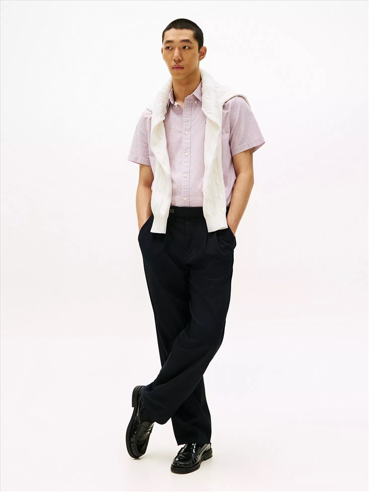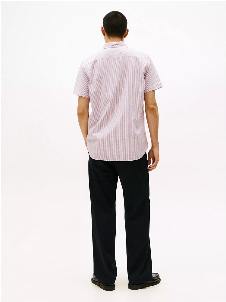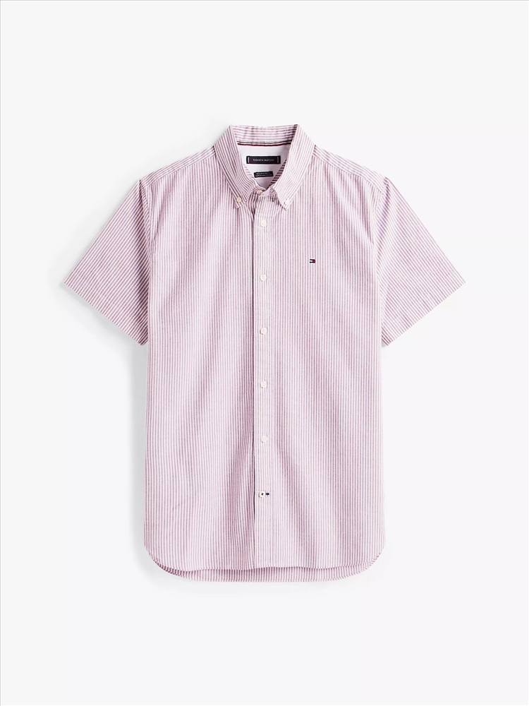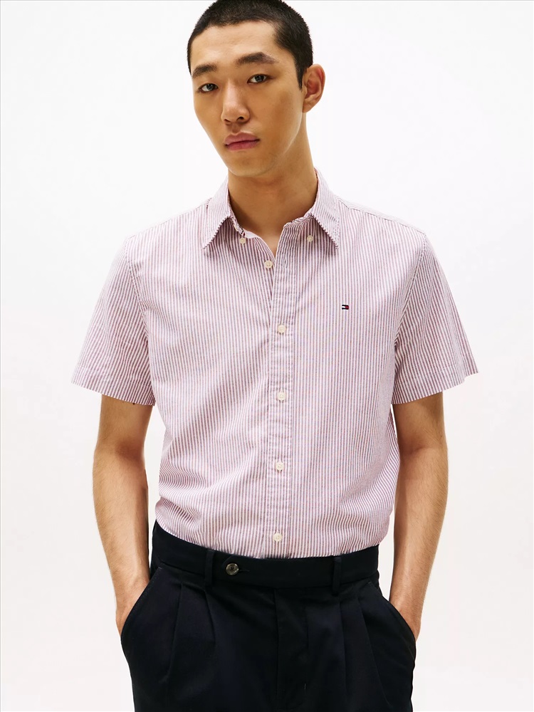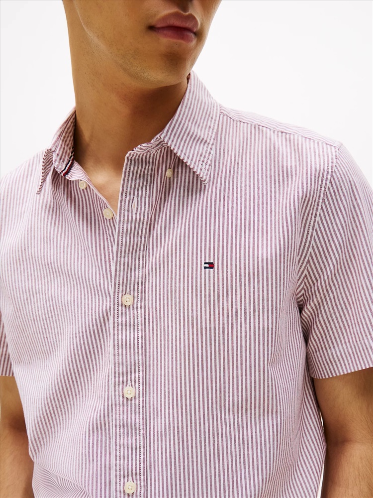 Tommy Hilfiger men's shirt. Embrace classic, easy-going style with this short-sleeve Oxford shirt, distinguished by its stripe print and subtle Tommy Hilfiger branding.