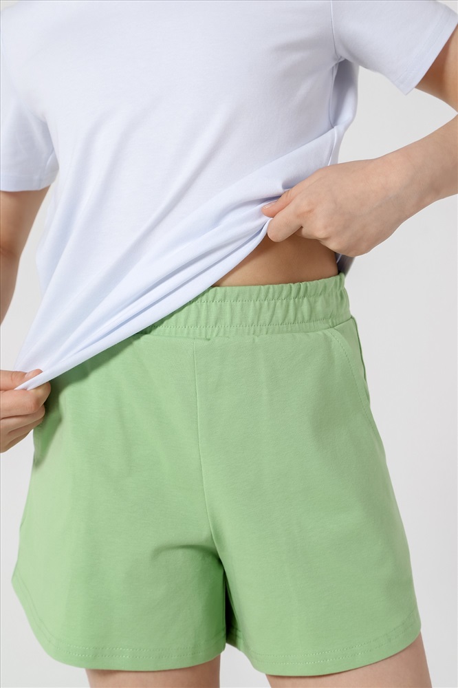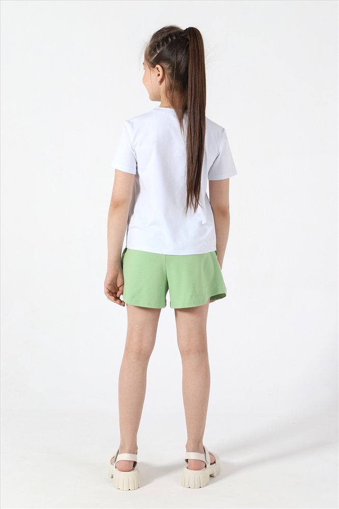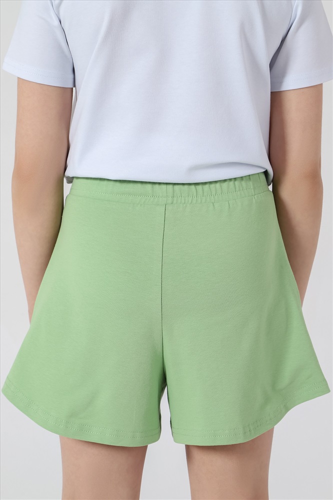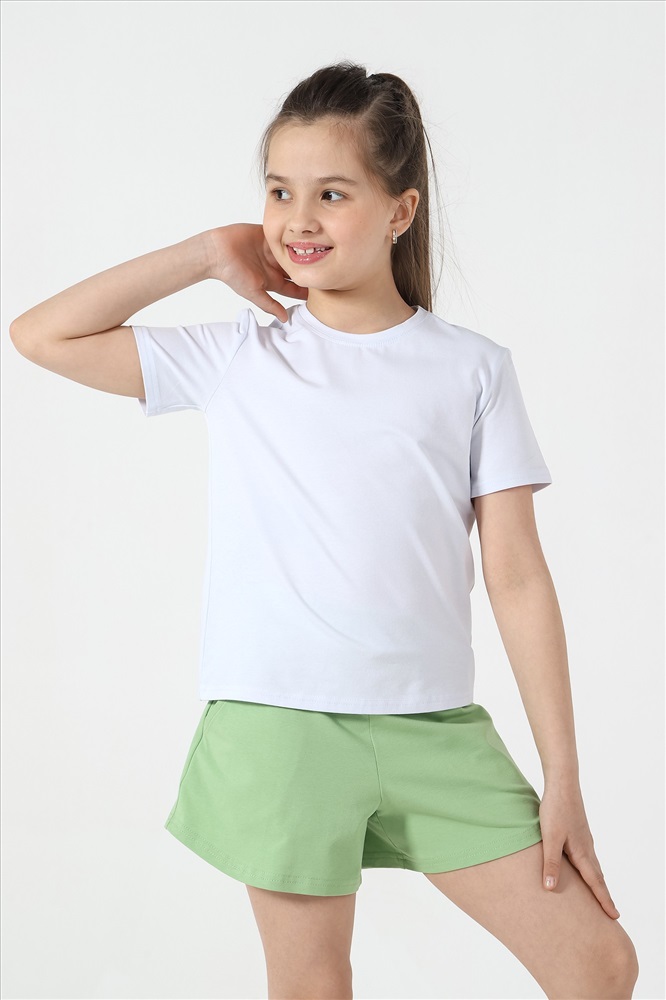 Шорты для девочки, из трикотажного полотна кулирного переплетения из хлопка с лайкрой. Модель слегка расширенная книзу, с боковыми карманами, на притачном поясе с отстроченной эластичной тесьмой, с фигурной линией низа.