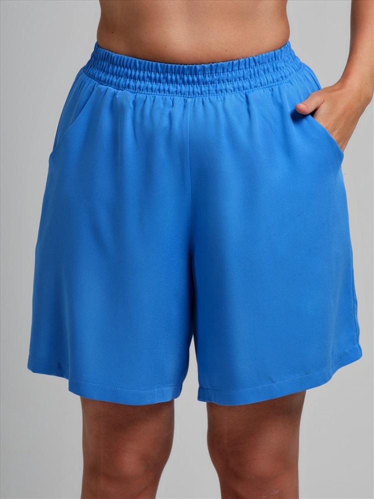 Шорты женские из гладкокрашеного тканого штапельного полотна, свободные, с карманами в боковых швах, на притачном поясе с эластичной тесьмой внутри. Средний шов передних половин обработан имитацией «гульфика»,
